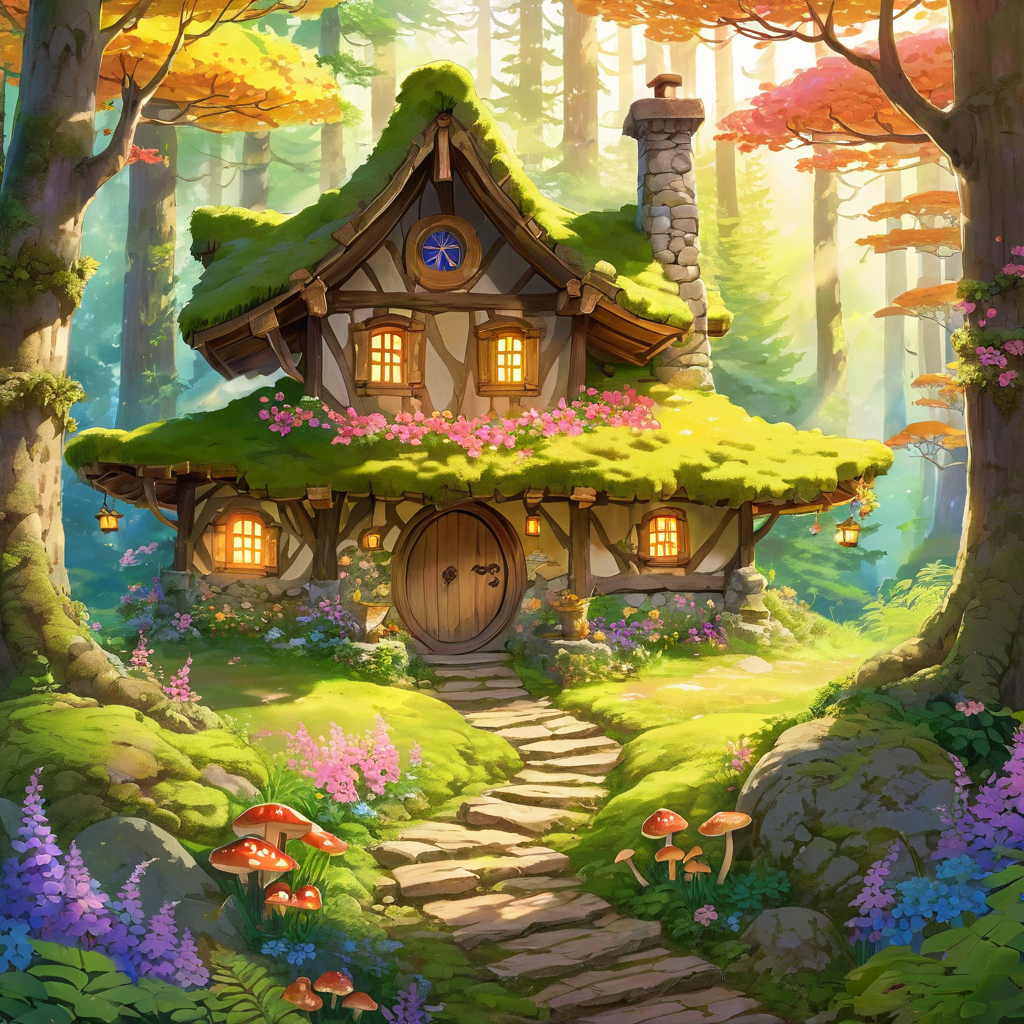 Промт: A magical anime-style forest bathed in soft golden light, with towering ancient trees whose branches are covered in glowing moss and colorful flowers. In the heart of the forest stands a small, cozy wooden cabin with a sloped roof, chimney, and warm light glowing from the windows. A narrow stone path leads to the door, lined with mushrooms, ferns, and sparkling fireflies. The air is filled with soft mist, and magical particles drift lazily among the trees. A small wooden fence surrounds a tiny garden with herbs and colorful plants. The whole scene feels peaceful, enchanted, and full of wonder, like a moment from a fantasy anime movie.