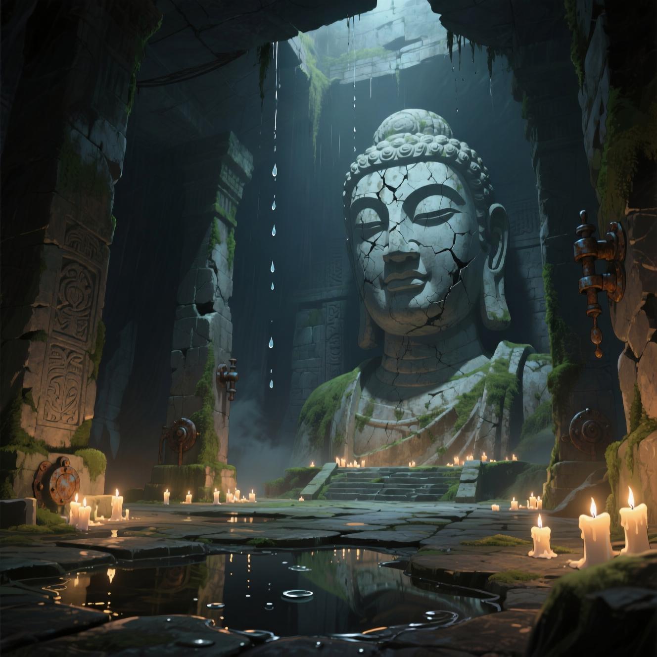 Промт: Anime style, ancient underground temple lit only by scattered candles, giant statues with cracked faces loom in the shadows. Damp stone floors, dripping water echoes.