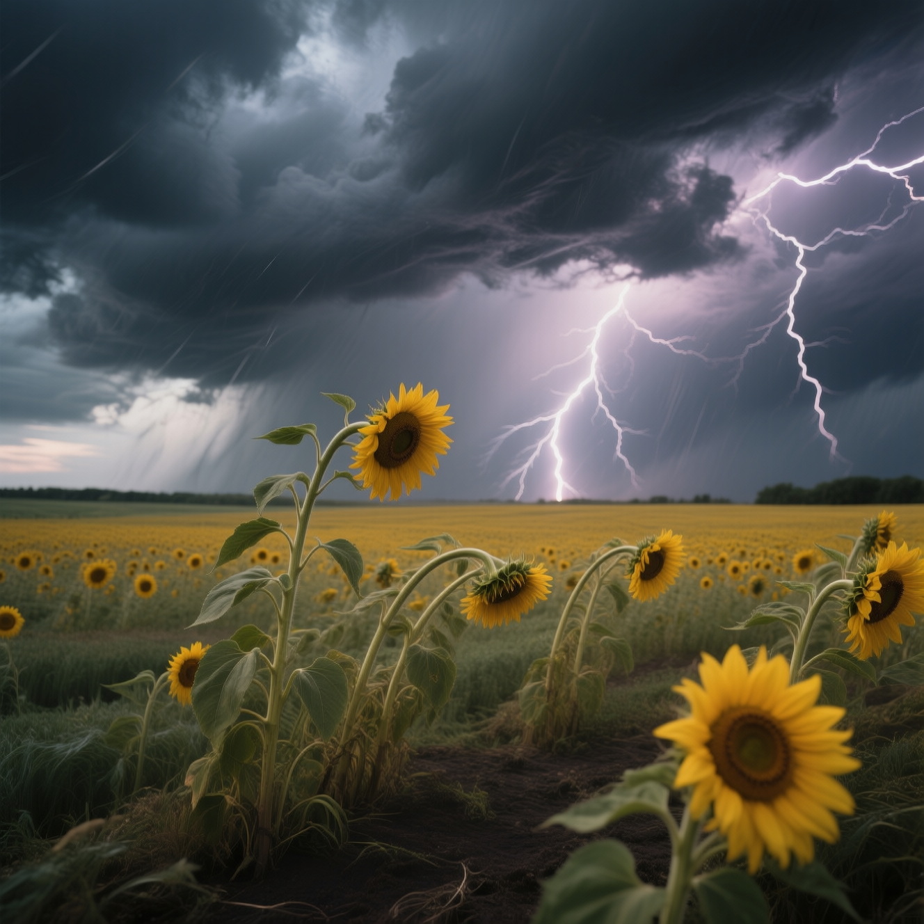 Промт: A storm sweeps across a sunflower field, the golden flowers bending in the wind. Dark clouds roll overhead, with streaks of lightning in the distance. Photorealistic, dramatic.