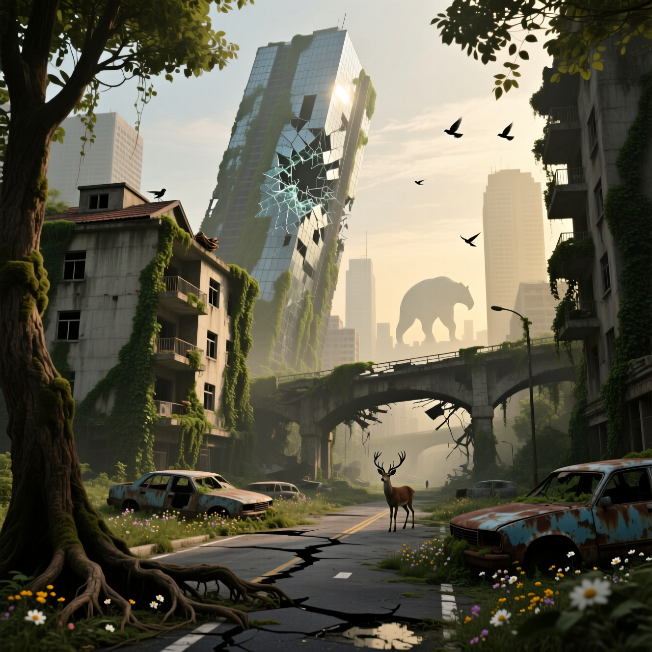 Промт: A vast abandoned and partially ruined megapolis, skyscrapers crumbling and overtaken by nature. Vines and ivy crawling up broken concrete walls, trees growing through cracked streets, grass and flowers sprouting from rooftops. Shattered windows reflect the pale daylight, while rusted cars and collapsed bridges hint at a long-gone civilization. In the distance, wild animals wander freely — deer among the ruins, birds nesting on ledges, and a faint silhouette of larger creatures far away. No signs of human presence, only silence and the sound of wind. The atmosphere is haunting yet beautiful, post-apocalyptic, overgrown, detailed and cinematic.
