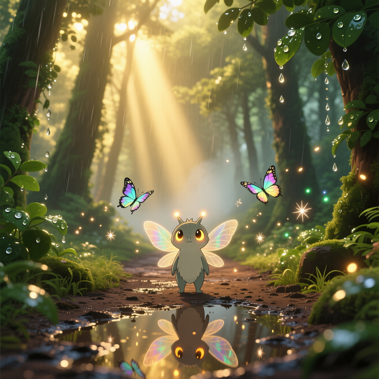 Промт: Anime style, a mystical forest trail just after the rain. Puddles glisten on the muddy path, reflecting the soft light. Sunbeams break through the tall, dense trees, creating shimmering rays of light in the misty air. Lush green leaves still dripping with raindrops, a fresh earthy atmosphere. On the trail stands a magical creature — small and whimsical, with glowing eyes and a gentle aura, blending naturally with the forest. Butterflies flutter around, and faint sparkles of light dance in the air, adding a touch of fantasy. Bright, detailed, enchanting, Studio Ghibli aesthetic, magical and serene.