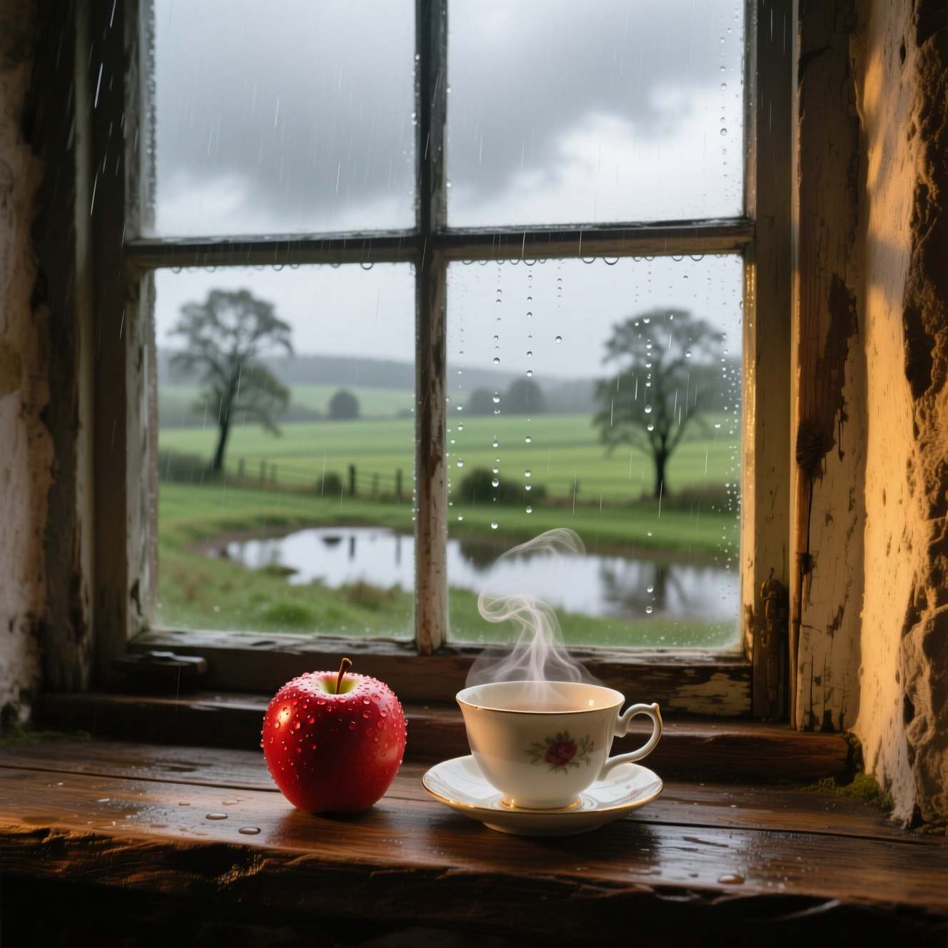 Промт: A cozy view from the window of a rustic countryside house. On the wooden windowsill rests a fresh red apple beside a steaming cup of hot tea, its vapor curling softly into the air. Outside, raindrops stream down the glass, blurring the view of a quiet rural landscape. The garden and fields beyond are soaked in rain, with puddles forming on the ground and trees swaying gently in the drizzle. Soft daylight filters through the gray clouds, casting a calm and nostalgic atmosphere. The scene feels warm, intimate, and atmospheric, contrasting the cozy interior with the rainy world outside.