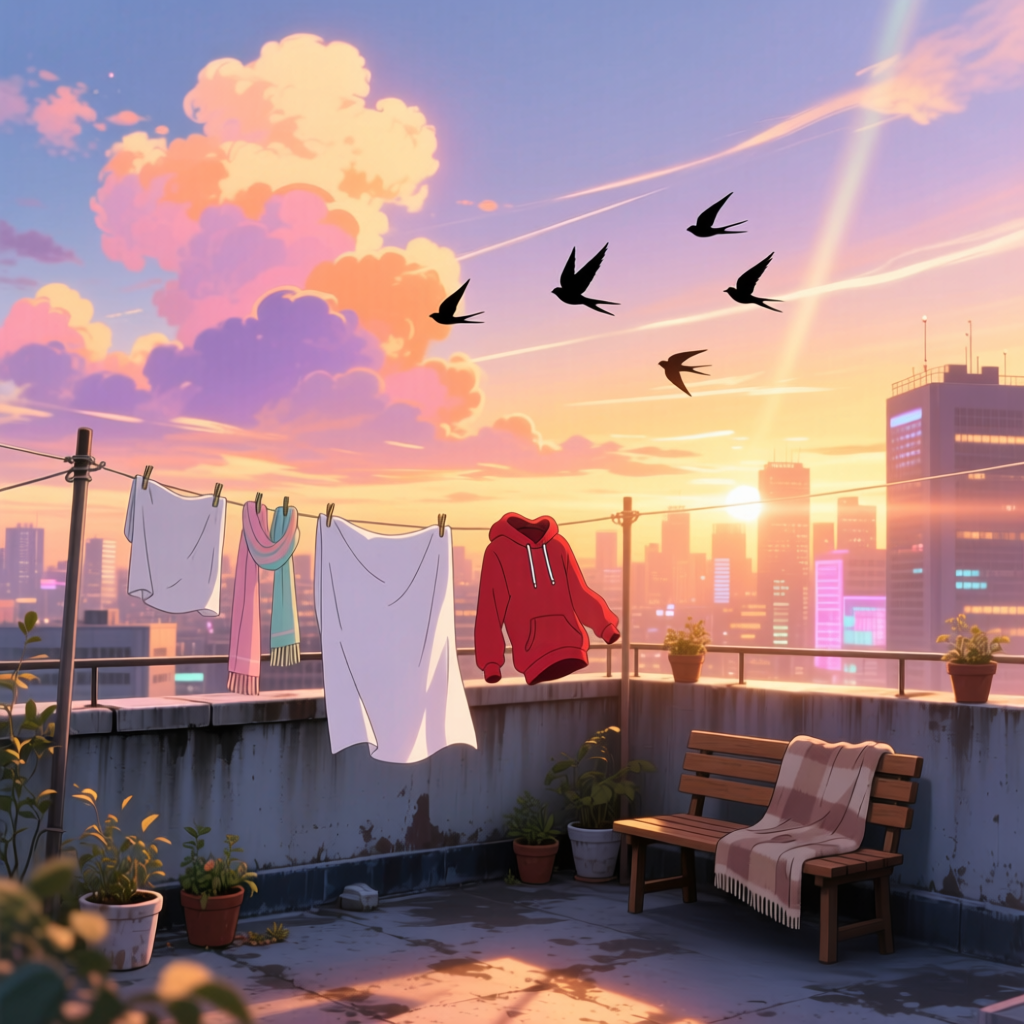 Промт: An anime-style rooftop scene in a modern city at sunset. Soft clouds glow orange and pink, while a gentle breeze stirs laundry hanging on a line. Birds fly past, silhouetted against the colorful sky. Warm, detailed, cinematic.