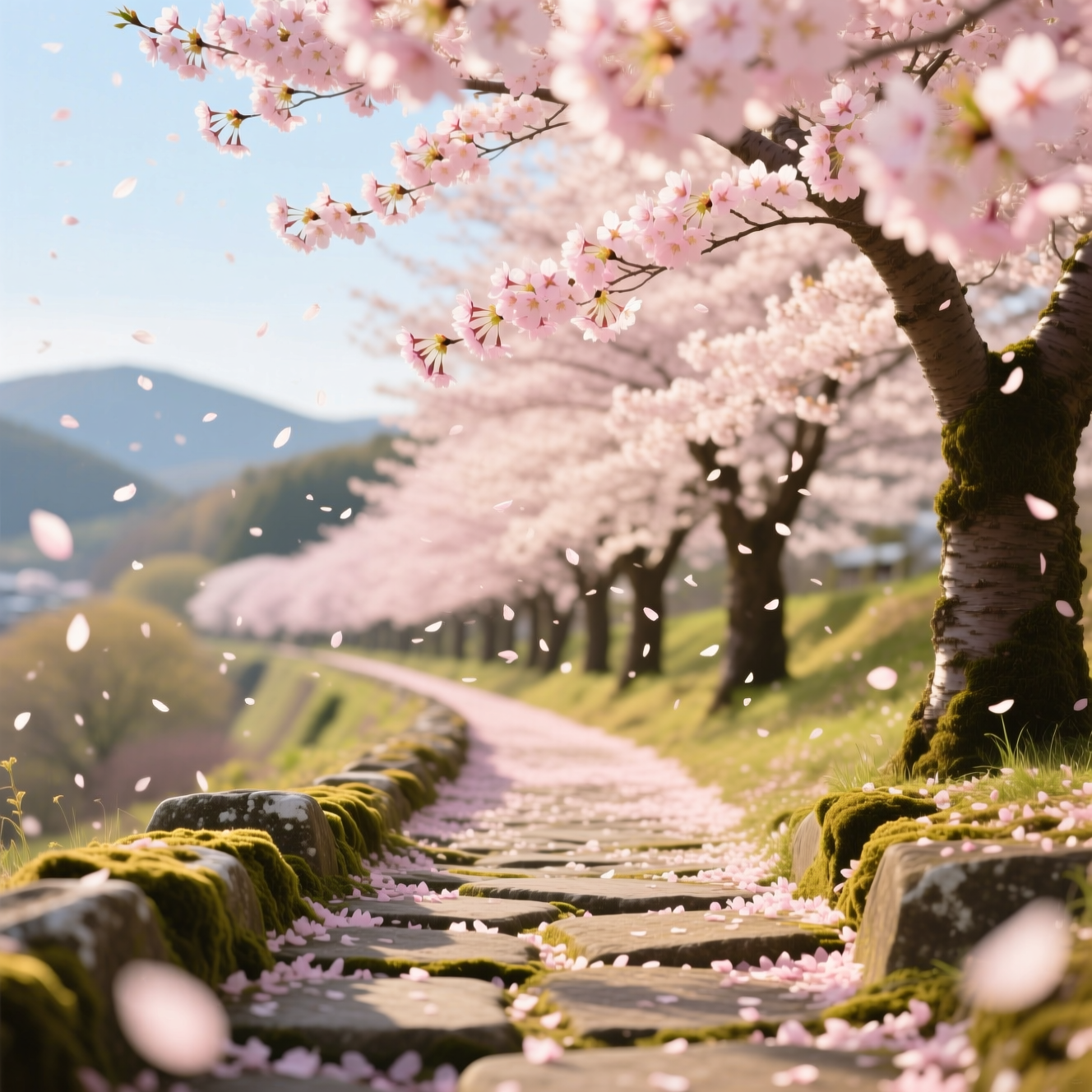 Промт: A row of cherry blossom trees in full bloom, petals drifting gently onto a stone path. A light breeze carries their sweet scent. Photorealistic, warm spring atmosphere.