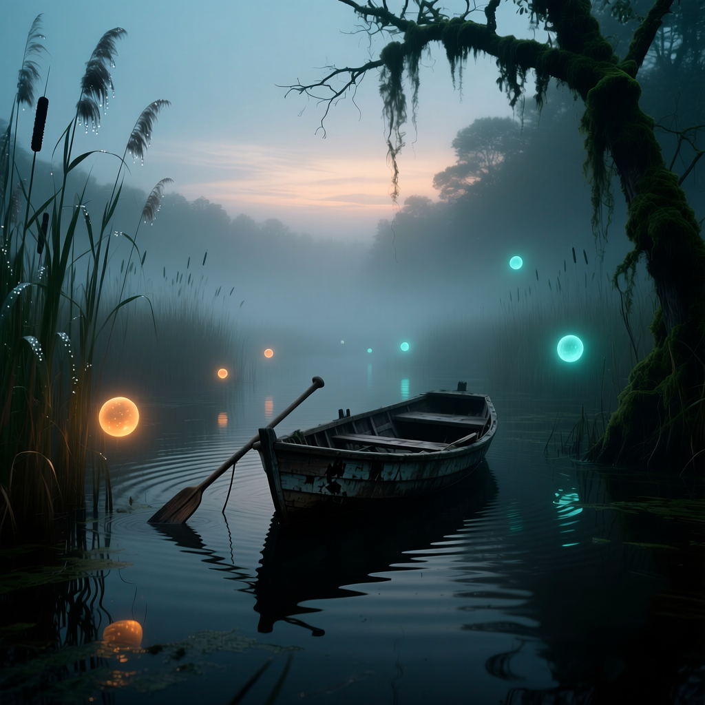 Промт: A misty swamp in cinematic realism, covered with dense fog and mysterious glowing orbs. A decaying wooden boat drifts between the reeds. Dark, eerie atmosphere.