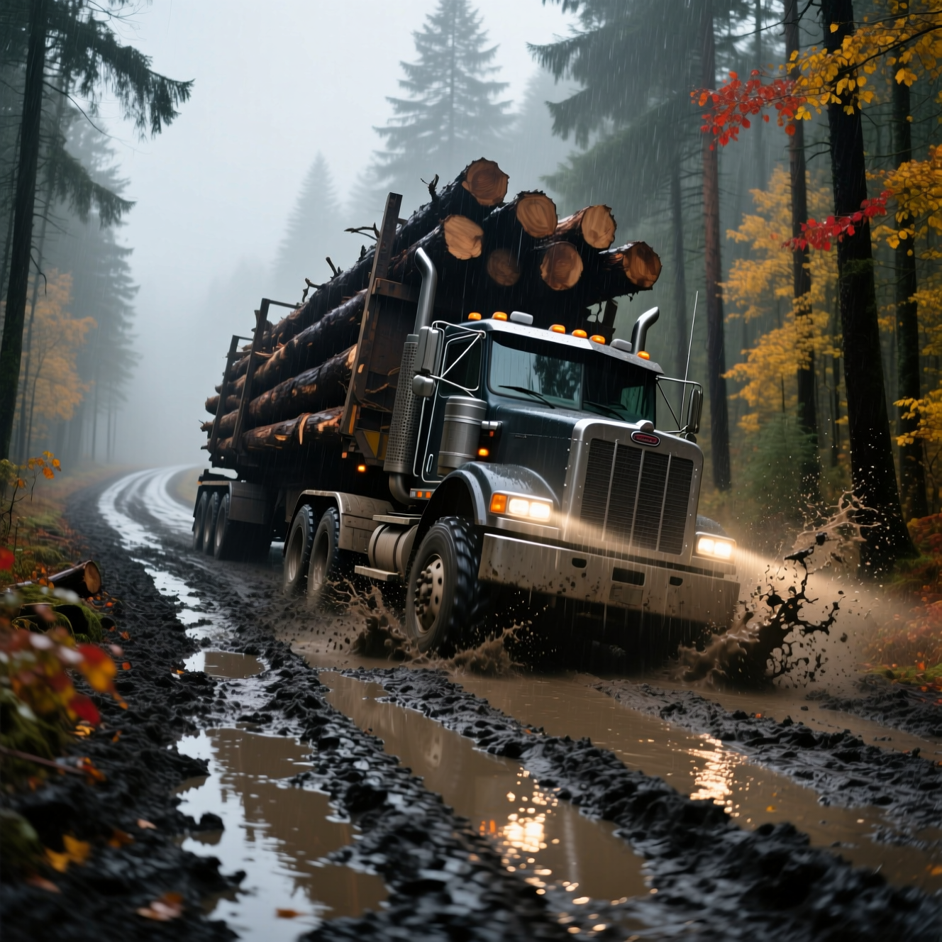 Промт: A large logging truck struggles along a muddy, uneven forest road on a rainy autumn day. The vehicle is heavily loaded with wet logs, its wheels sinking deep into the ruts filled with dirty water. The truck tilts slightly to one side as it climbs over the rough, slippery terrain. Rain pours steadily, creating ripples and small streams running down the road. Around the truck, the forest is dense — tall pines and birches with yellow and red leaves glistening under the rain. Fog hangs low between the trees, and the headlights of the truck cut through the mist, reflecting off the wet ground. Mud splashes from the tires, and the atmosphere feels raw, cold, and realistic — a scene full of struggle, power, and nature’s harsh beauty.