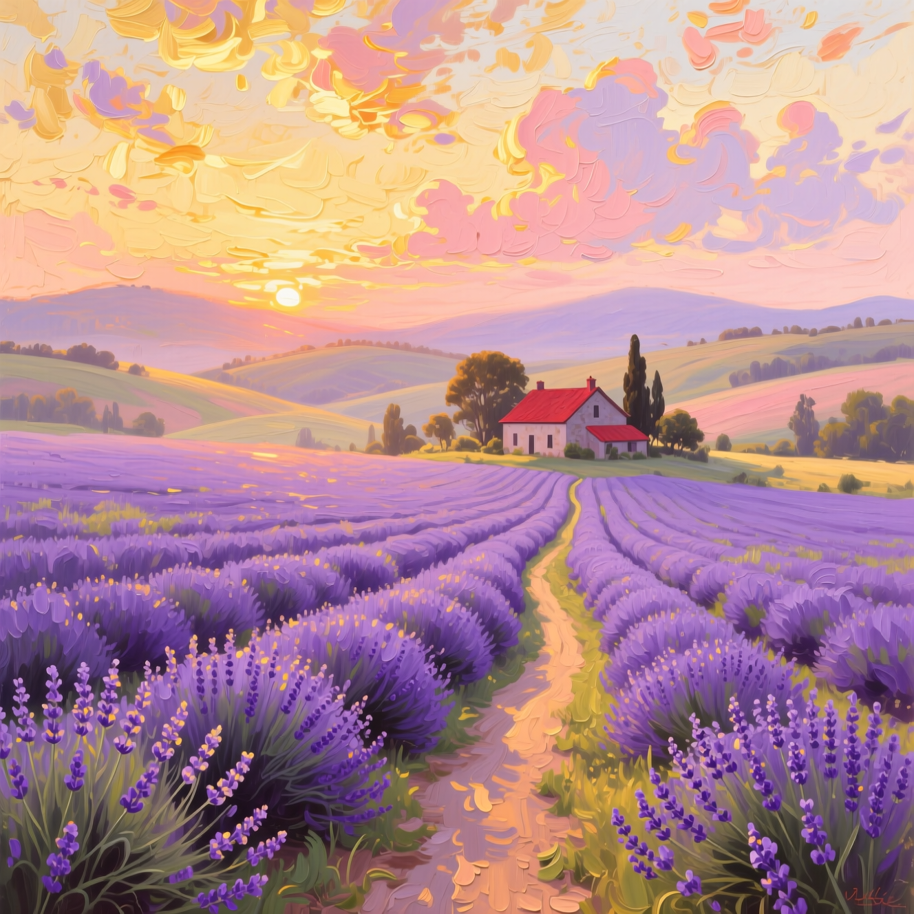Промт: Oil painting style, a vast lavender field glowing under the warm light of sunset. Endless rows of purple flowers stretch toward the horizon, gently swaying in the evening breeze. Golden sunlight bathes the landscape, creating soft highlights and deep shadows. In the distance, rolling hills fade into a haze of orange and pink tones. A narrow dirt path winds through the lavender, leading to a small farmhouse with a red roof. The sky is painted in vibrant strokes of gold, peach, and violet, with scattered clouds reflecting the fading light. The scene feels calm, romantic, and timeless — full of warmth and the scent of summer.