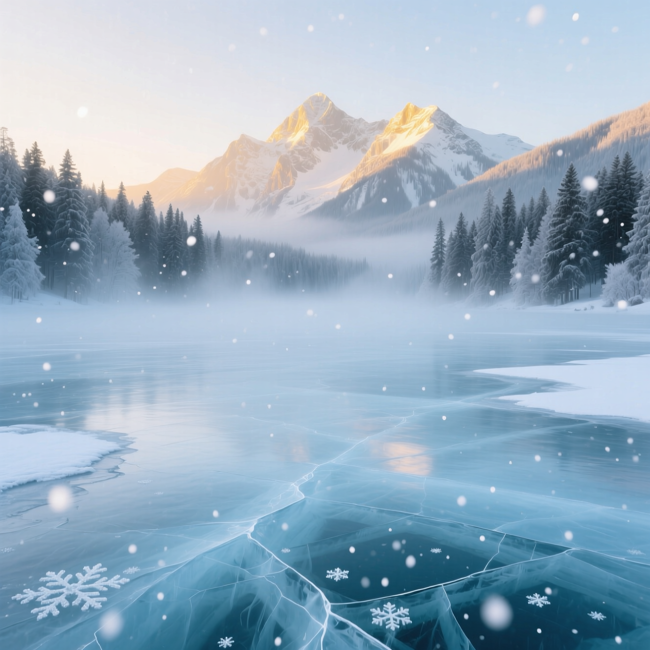 Промт: Realistic style, a frozen mountain lake surrounded by snow-covered pines. The surface of the ice is smooth and pale blue, marked by delicate cracks that shimmer in the cold light. Soft mist drifts above the lake, blurring the outlines of the nearby forest. Snowflakes fall slowly through the still air, landing gently on the icy surface. In the distance, tall mountains rise, their peaks glowing faintly in the pale winter sun. The scene feels calm, cold, and silent — a peaceful moment frozen in time, filled with the quiet beauty of winter wilderness.