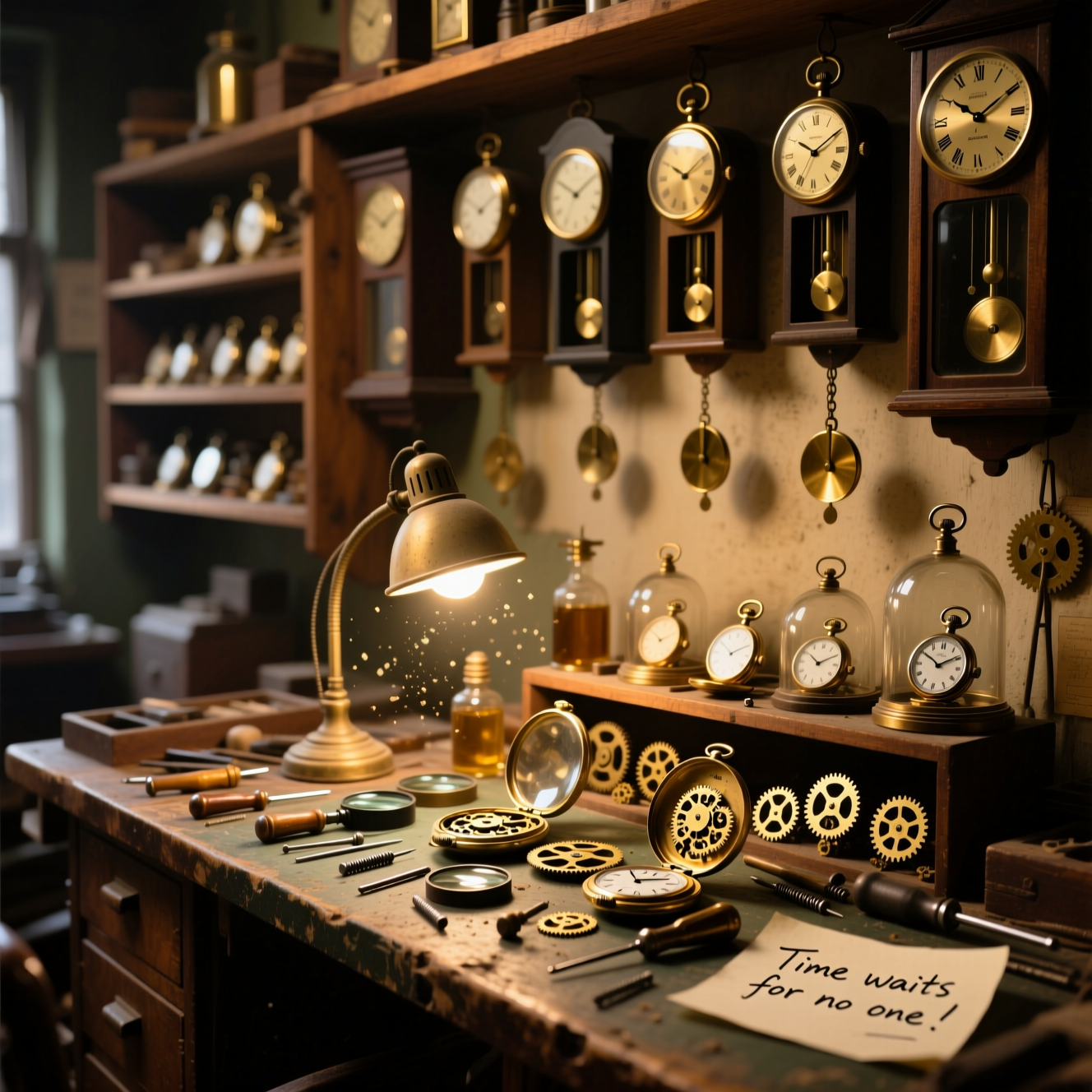 Промт: A realistic scene of an old watchmaker’s workshop filled with the quiet ticking of countless clocks. Wooden shelves are lined with pocket watches, gears, and glass domes, each reflecting the soft glow of a small desk lamp. The workbench is cluttered with tiny screwdrivers, magnifying lenses, and open timepieces revealing intricate brass mechanisms. The air smells faintly of oil and metal, and dust motes float in the dim, golden light. On the wall, pendulum clocks move in unison — creating a calm, rhythmic, and nostalgic atmosphere frozen in time.