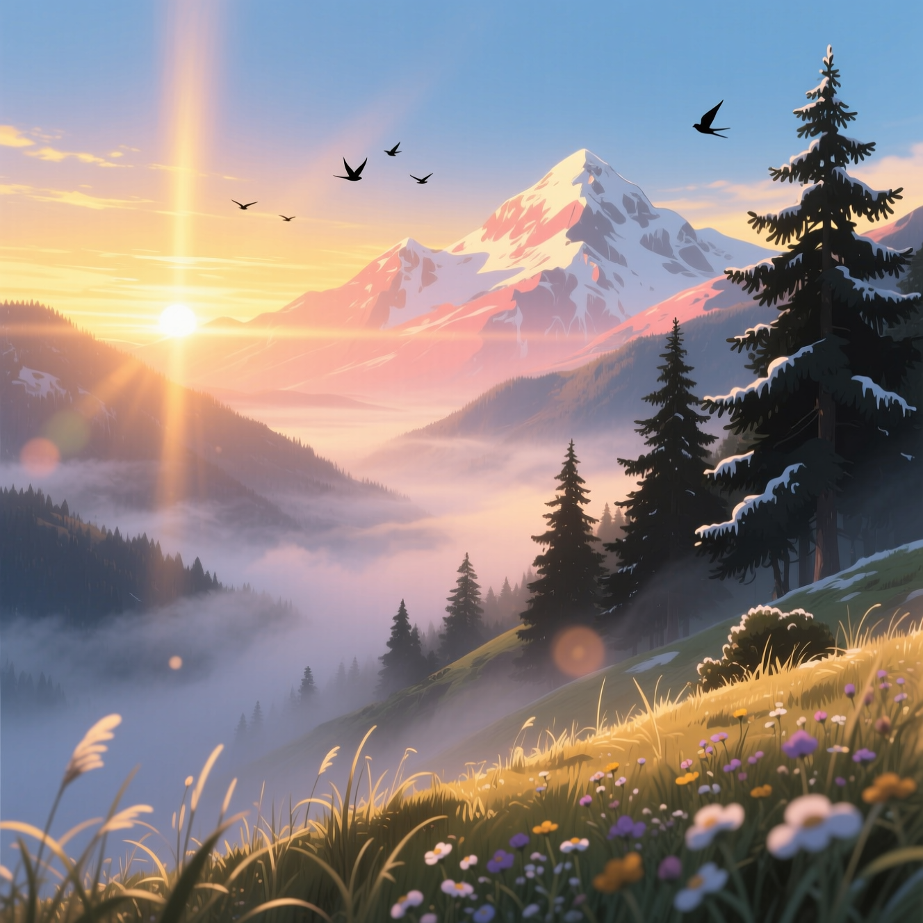 Промт: Anime-style sunrise in the mountains — a breathtaking scene where soft mist curls through the valleys, glowing faintly in the golden morning light. The first rays of the sun touch the snow-capped peaks, painting them in warm shades of pink and orange. Evergreen trees stand tall along the slopes, their tops emerging through the fog. A gentle breeze stirs the grass and wildflowers on a nearby ridge, and distant birds soar across the glowing sky. The atmosphere feels peaceful, pure, and full of quiet wonder — the world awakening beneath a new dawn.
