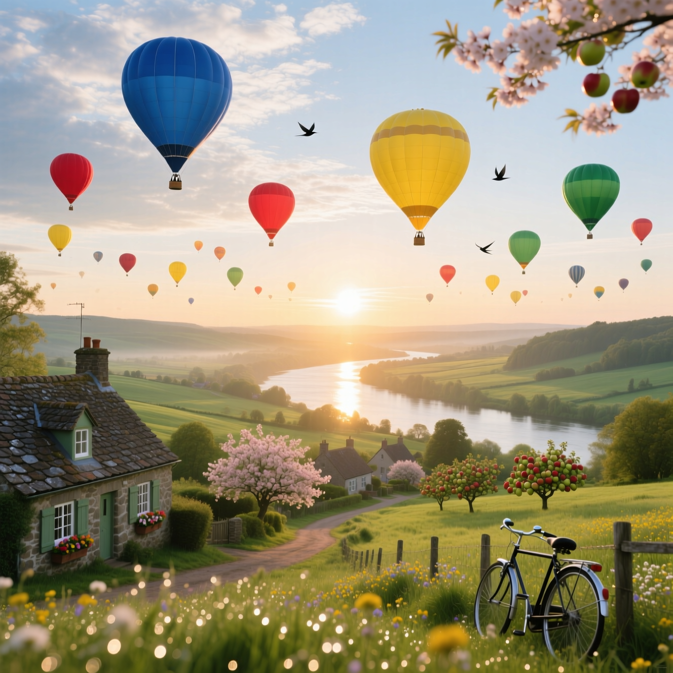 Промт: A realistic summer morning scene with dozens of colorful hot air balloons floating gracefully above a peaceful countryside village. The rising sun bathes the landscape in warm golden light, casting long shadows across the rooftops and fields. Below, the small village is surrounded by green meadows and blooming trees, while in the distance, a wide river glimmers in the sunlight, winding gently through the valley. The sky is clear with a few soft clouds, and the air feels calm and bright. The atmosphere is joyful, dreamy, and full of quiet wonder — a perfect morning filled with color and light.