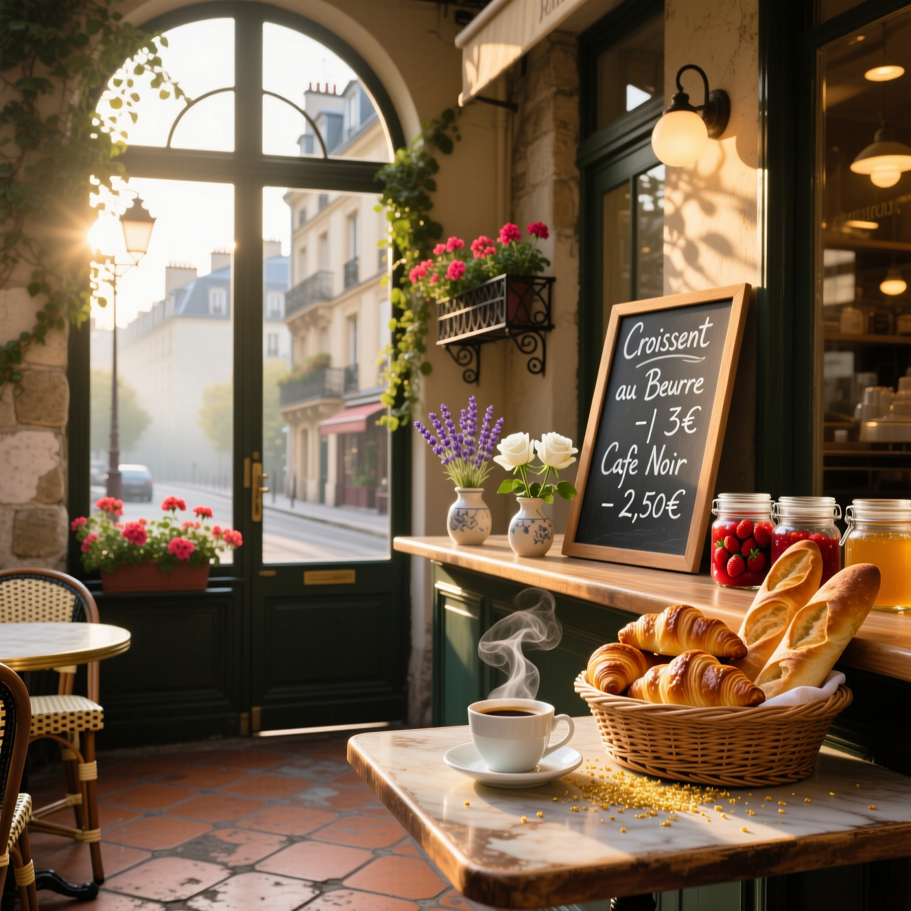 Промт: A realistic morning scene inside a small Parisian café. Warm golden sunlight streams through the large front window, casting soft patterns on the tiled floor and wooden tables. On the counter — a basket of freshly baked croissants and baguettes, their crusts glistening. A cup of hot coffee sits on a saucer, steam rising gently in the cool morning air. Outside the window, a quiet Paris street with wrought-iron balconies and flower boxes is just waking up. Glass jars with jam, small vases with flowers, chalkboard menu in French. The atmosphere is cozy, elegant, and full of that slow Paris morning charm.