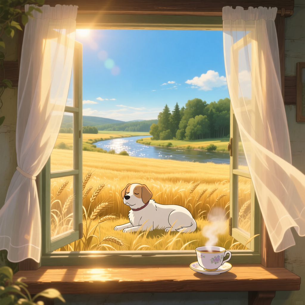 Промт: Anime style, a peaceful view from the window of a cozy countryside house. Outside stretches a wide golden field touched by the warm light of the afternoon sun. In the distance, a calm river winds gently toward a dense green forest beneath a bright blue sky. A dog sits quietly in the middle of the field, its fur glowing softly in the sunlight as the breeze moves the tall grass around it. Curtains flutter lightly near the window, and a cup of tea rests on the wooden sill. The atmosphere is calm, nostalgic, and filled with gentle warmth — a perfect countryside moment frozen in time.
