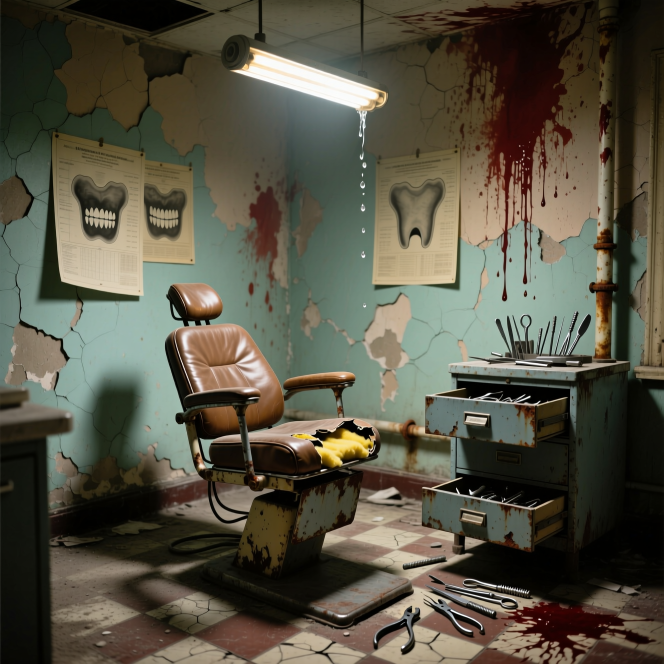 Промт: A realistic horror-style scene of an old, abandoned dentist’s office — unsettling but without any figures or monsters. The walls are worn and cracked, with faded paint peeling away and faint reddish stains hinting at the room’s grim past. A single overhead lamp flickers weakly, casting uneven light across the dusty floor. The old dentist’s chair stands in the middle, its leather seat torn and the metal base rusted. Drawers hang open, with scattered tools lying nearby, glinting faintly. The tiled floor is cracked, and water drips steadily from a pipe in the corner. The air feels cold, still, and heavy — a quiet, eerie reminder of a place long forgotten.