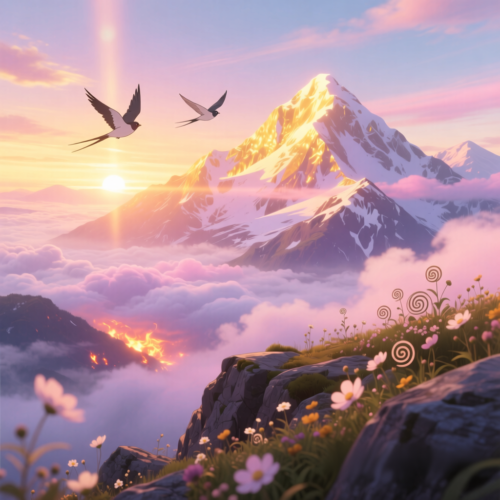 Промт: Anime style, a breathtaking sunrise high in the mountains above the clouds. The golden light of dawn spills across the snow-capped peaks, painting them in warm shades of gold and pink. Wisps of clouds drift gently below, moving like waves in a silent sea. A cool mountain breeze stirs the grass and wildflowers on a rocky ridge, carrying petals through the air. Birds glide gracefully across the rising sun, their wings catching the morning light. The atmosphere is serene, majestic, and full of quiet wonder — the world awakening in the calm beauty of a new day above the clouds.