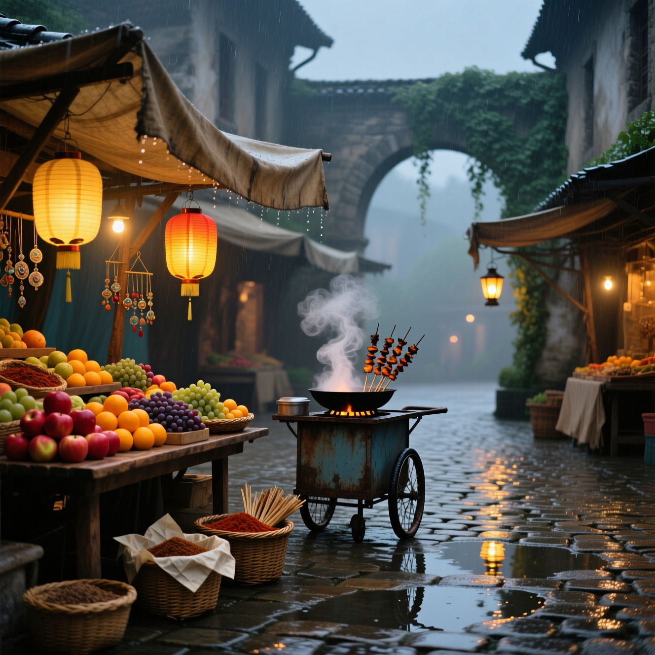 Промт: A realistic evening scene of an old open-air market during a gentle rain. The cobblestone streets glisten with reflections of colorful lanterns and the soft glow of nearby stalls. Worn awnings shelter wooden tables filled with fruits, spices, and trinkets, left waiting in the quiet drizzle. Steam rises from an unattended food cart, mingling with the mist and carrying a faint scent of roasted food. Rain patters softly on canvas roofs, forming small ripples in puddles along the street. The air feels warm and alive despite the emptiness. The atmosphere is peaceful, nostalgic, and cinematic — a marketplace paused in time under the soft rain.