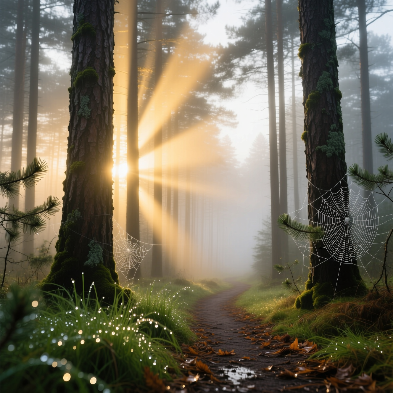 Промт: A realistic early morning scene in a quiet pine forest wrapped in soft mist. The rising sun sends golden rays through the tall, straight trunks, scattering light into gentle beams. Dew clings to the grass, pine needles, and spiderwebs, sparkling faintly in the morning glow. The air is cool and damp, filled with the scent of pine and earth. Wisps of fog drift slowly between the trees, blurring the distance into silvery haze. A narrow path winds through the forest, covered in fallen needles and traces of yesterday’s rain. The atmosphere is calm, pure, and full of quiet beauty — the peaceful breath of nature at dawn.