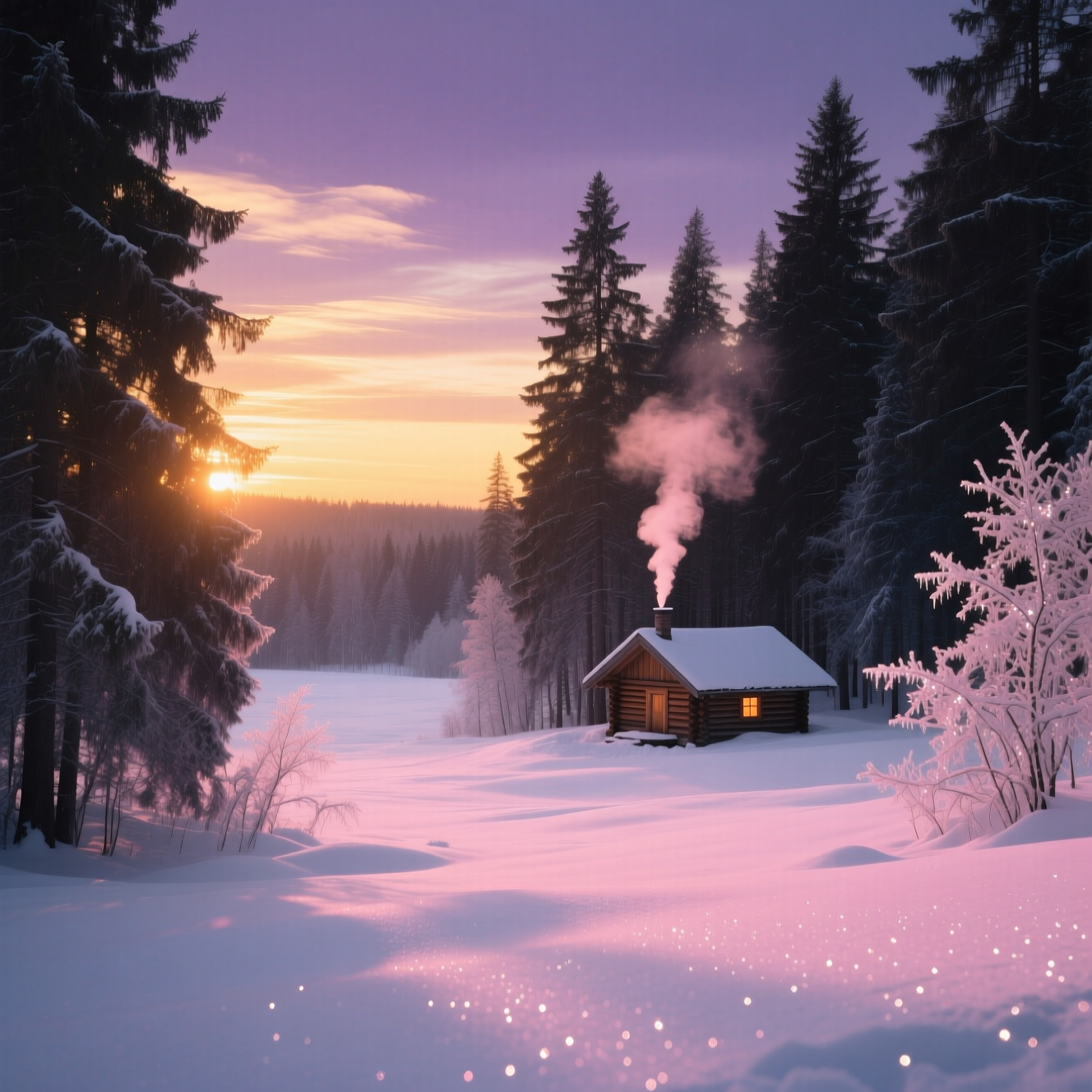 Промт: A winter forest at sunset: soft pink light spreads across the snow, making the drifts glow gently between tall dark pines. Long shadows stretch over the ground as the sky turns gold and lavender. In the distance, a small wooden cabin stands among the trees, a thin plume of smoke rising from its chimney and curling into the cold air. Frost glitters on branches like tiny crystals, and the scene feels quiet, warm, and deeply serene.