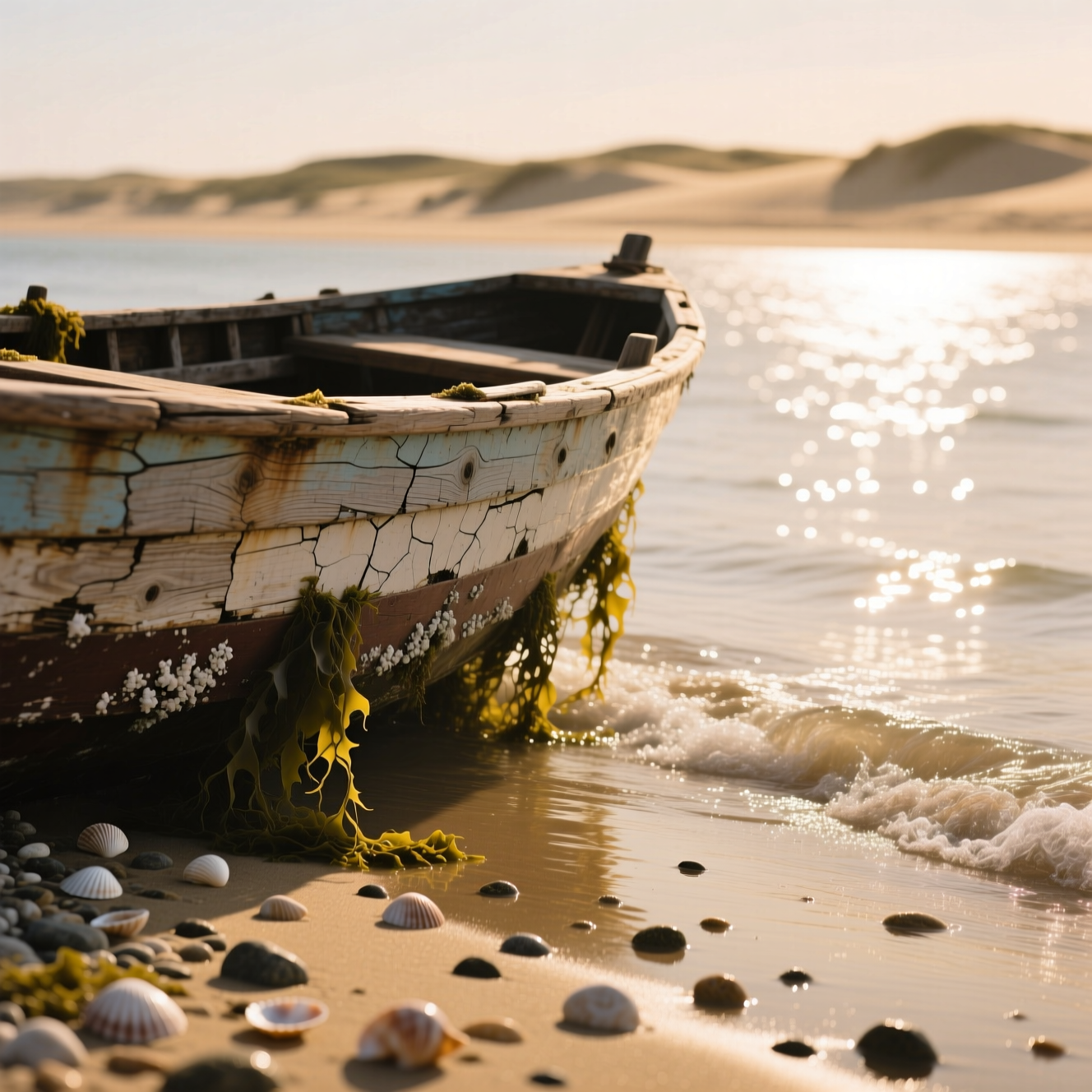 Промт: An old wooden boat rests near the shoreline, its weathered hull cracked and faded by years of sun and salt. Gentle waves lap against the sand, creating soft rhythmic sounds around the vessel. Seaweed clings to the lower planks, and small shells lie scattered along the beach. Warm light reflects off the water, casting shifting patterns on the boat’s surface. The scene feels quiet, nostalgic, and touched by the calm breath of the sea.