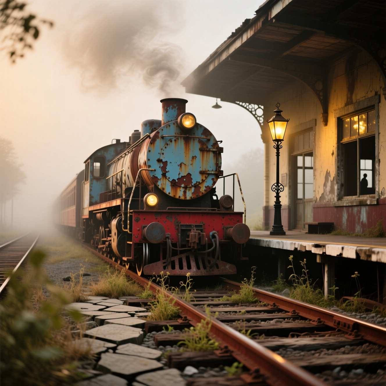 Промт: An abandoned train rests at an old forgotten station, its metal sides faded and peeling as rust eats into the once-bright paint. The tracks beneath are worn and reddish, disappearing into thick drifting fog. A lone lantern near the platform casts a soft, golden glow that reflects weakly off the train’s windows. Weeds grow between the sleepers, swaying gently in the cool air. The whole scene feels quiet, ghostly, and steeped in nostalgic decay.