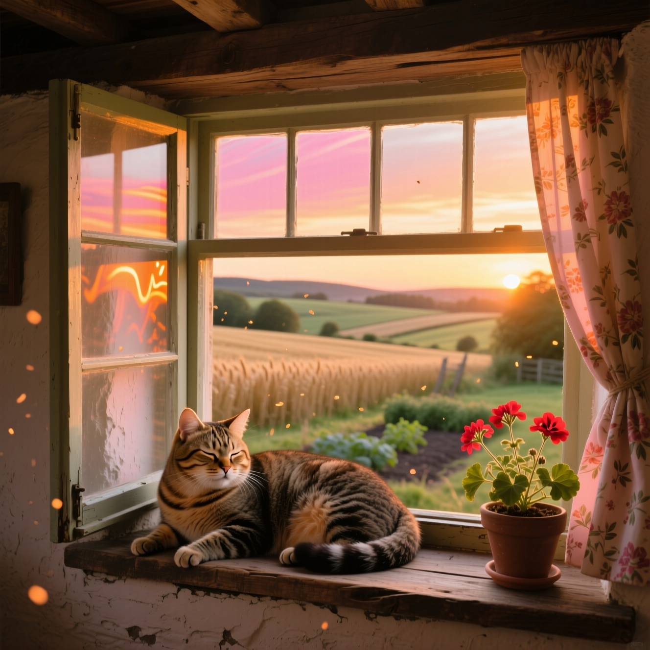 Промт: A cat rests on a wooden windowsill in a peaceful village home, its fur warmed by the soft glow of the setting sun. Outside, fields and a quiet garden stretch into golden light, swaying gently in the evening breeze. The window glass reflects warm hues of orange and pink, casting subtle patterns on the wall. Dust motes drift lazily in the sunlight, and the whole scene feels cozy, serene, and filled with gentle rural warmth.