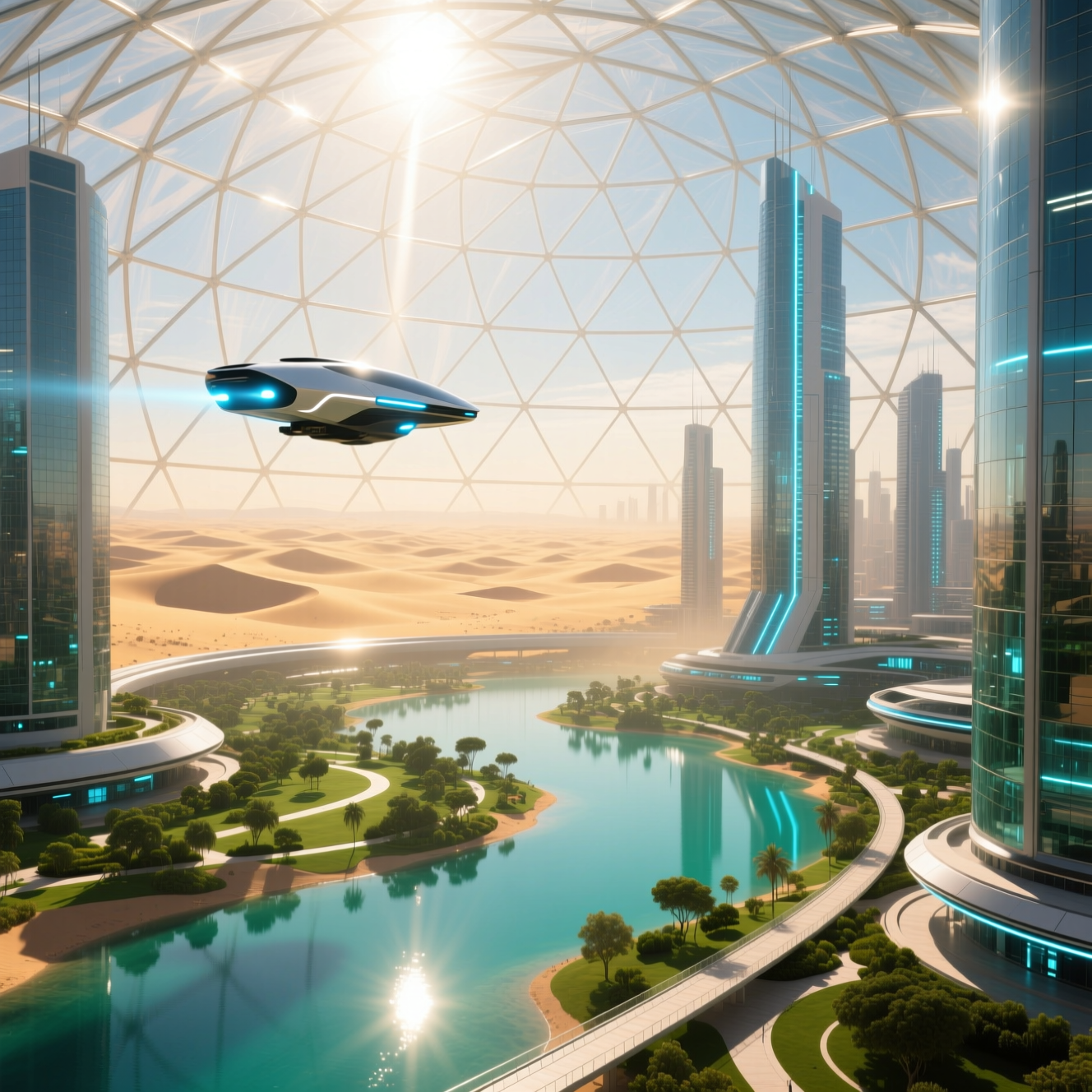Промт: A futuristic city enclosed within a massive transparent dome: outside lies a barren desert of dunes and scorching light, while inside flourish green parks, shimmering lakes, and bright walkways. Sleek flying vehicles glide between tall glass towers, their lights reflecting on the curved inner surface of the dome. Soft artificial daylight blends with real sunlight filtering through. The contrast between harsh wasteland and vibrant life creates a striking, harmonious atmosphere.