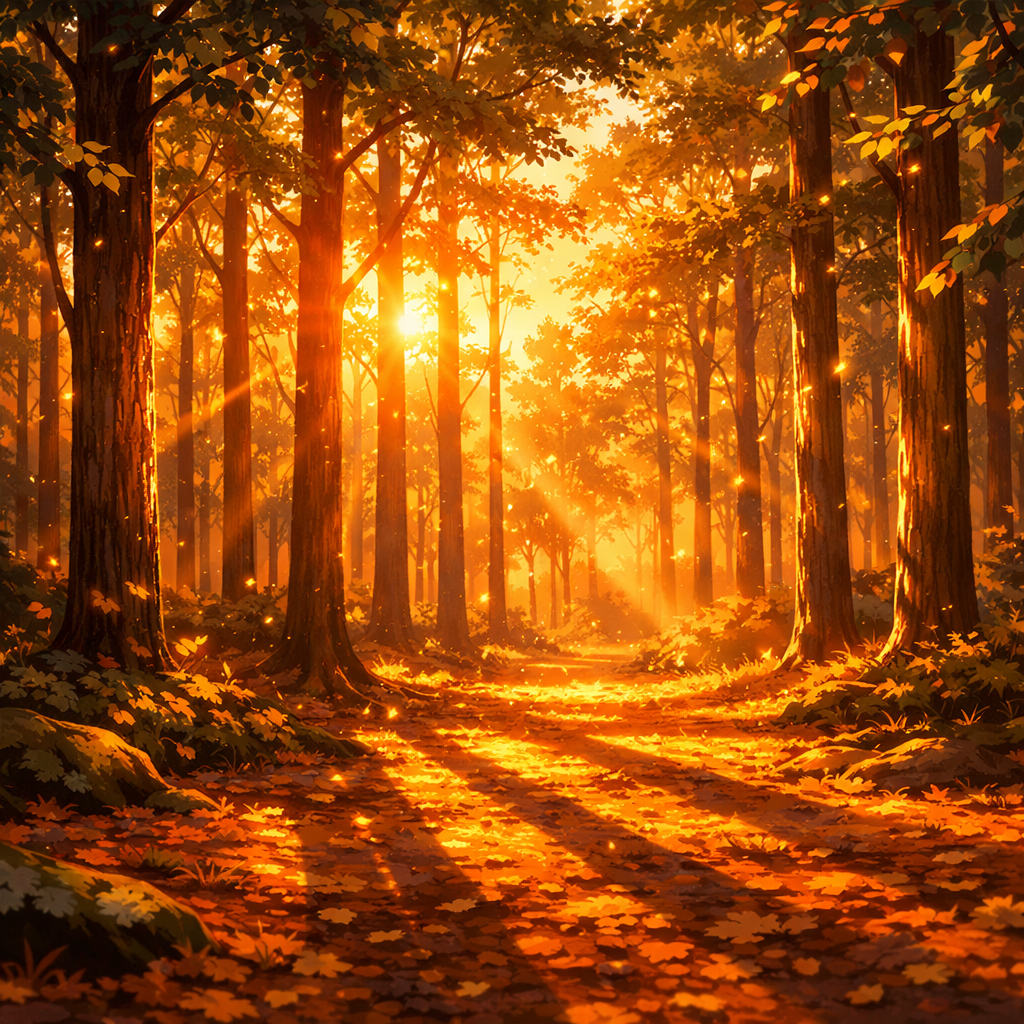 Промт: Anime-style forest at sunset: warm orange and amber rays stream between tall tree trunks, painting the ground with glowing bands of light. Leaves catch the sunlight and shimmer softly as a gentle breeze moves through the canopy. Long shadows stretch across the forest floor, covered with fallen leaves and moss. Dust and pollen drift lazily in the air, and the entire scene feels calm, nostalgic, and wrapped in a cozy, golden evening atmosphere.