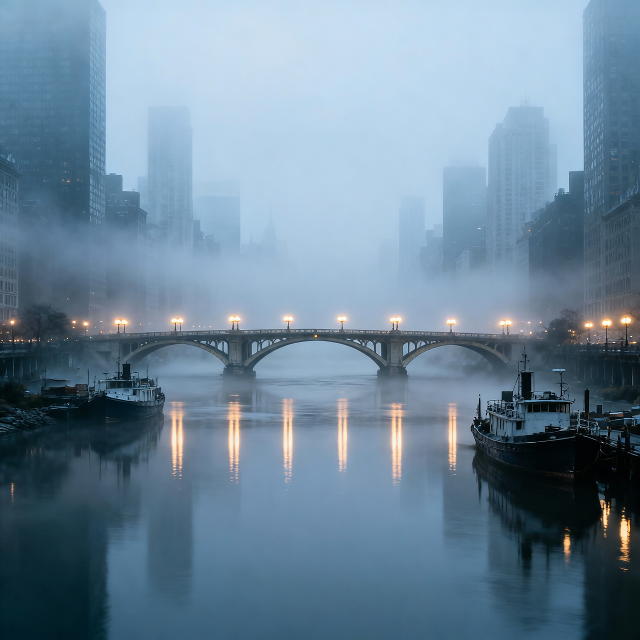 Промт: A city wrapped in thick fog, with a wide river flowing quietly through its center. Tall buildings fade into pale silhouettes as mist softens their outlines. Arched bridges cross the water at intervals, their lamps glowing faintly and reflecting as blurred streaks on the surface. Boats rest motionless along the banks, barely visible through the haze. The air feels cool and damp, sounds muted, creating a calm, mysterious atmosphere where the city seems suspended between presence and disappearance.