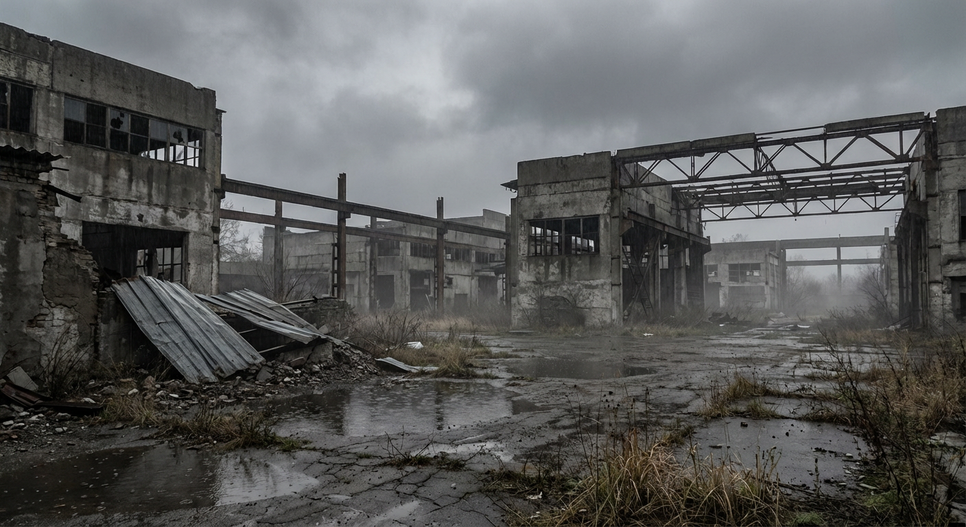 Промт: An abandoned factory stands under an overcast sky, its massive concrete buildings dark and weathered. Rusted metal beams protrude from broken walls, and shattered windows stare out like empty eyes. Damp ground reflects dull gray light, forming shallow puddles among cracked asphalt. Weeds and dead grass grow through gaps in the pavement. A cold wind moves loose sheets of metal and debris, and the air feels heavy and silent, creating a bleak, oppressive atmosphere filled with decay, neglect, and forgotten industry.