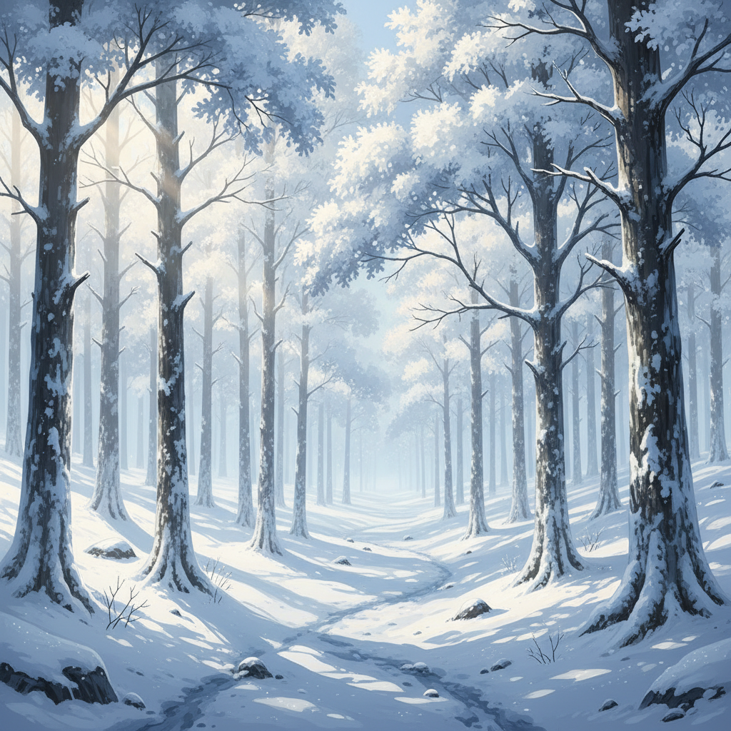 Промт: Anime-style winter forest on a frosty day: tall trees stand coated in sparkling ice crystals, their branches heavy with fresh snow. Pale sunlight filters through the canopy, casting cool blue shadows across the ground. Frost glitters on bark and needles, and a faint mist drifts in the crisp air. Footpaths are softened by snow, rocks peek through with icy sheen, and the silence feels sharp and pure, filled with cold clarity and serene winter beauty.