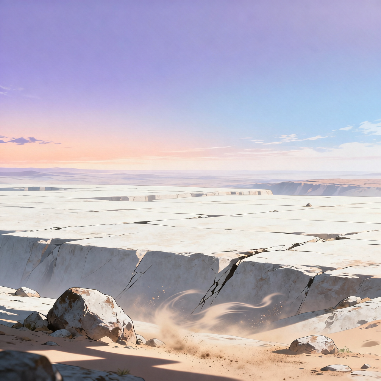 Промт: Anime-style rocky plateau stretching endlessly beneath a vast open sky, emphasizing minimalism and scale. Smooth stone surfaces extend in wide planes, broken only by a few scattered boulders and fine cracks. Soft light casts gentle gradients and long, clean shadows, highlighting the simplicity of the terrain. The horizon feels distant and quiet, with subtle color shifts in the sky. A light breeze carries dust across the ground, creating a calm, spacious atmosphere filled with silence, balance, and contemplative openness.