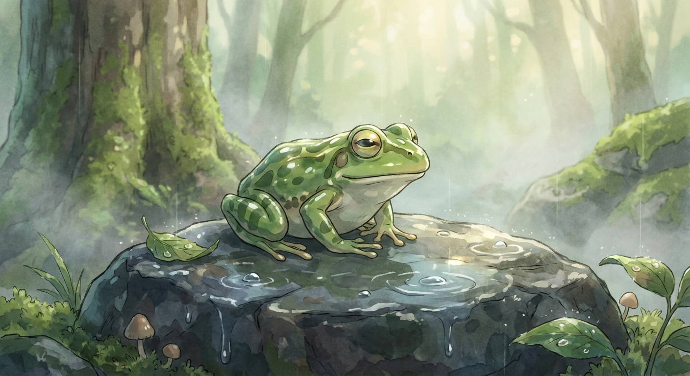 Промт: Anime-style close-up of a frog resting on a wet stone after rain. The smooth rock glistens with water, reflecting soft highlights and tiny ripples from falling droplets. The frog’s skin shines slightly, detailed with subtle textures and natural patterns. Around it, moss and small plants glow in muted green tones. A gentle mist hangs in the air, and diffused light creates a calm, intimate atmosphere filled with freshness, quiet focus, and the delicate beauty of a rainy moment.