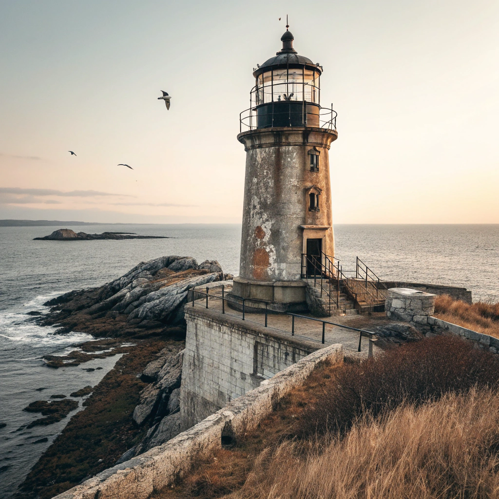 Промт: An old lighthouse stands along a rugged coastline in daylight, its lantern dark and inactive. Weathered stone walls show cracks, stains, and traces of salt from years of wind and waves. Seabirds circle around the tower, perching on railings and ledges. The sea below moves steadily, reflecting muted daylight under a pale sky. Dry grass and rocks surround the base, and the atmosphere feels quiet, timeless, and slightly melancholic, marked by endurance, isolation, and the slow passage of time.