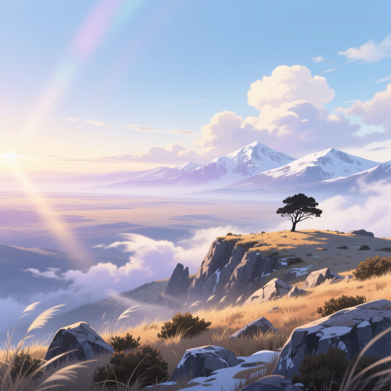 Промт: Anime-style high-altitude plateau stretching beneath a vast open sky. The land is rugged and sparse, covered with short grass, hardy shrubs, and scattered rocks shaped by wind and cold. Thin mountain air feels crisp and clear, carrying drifting clouds that cast slow-moving shadows across the ground. Distant peaks rise along the horizon, softened by atmospheric haze. Cool sunlight creates gentle gradients of light and color, and the scene feels quiet, expansive, and elevated, filled with solitude, scale, and calm mountain stillness.