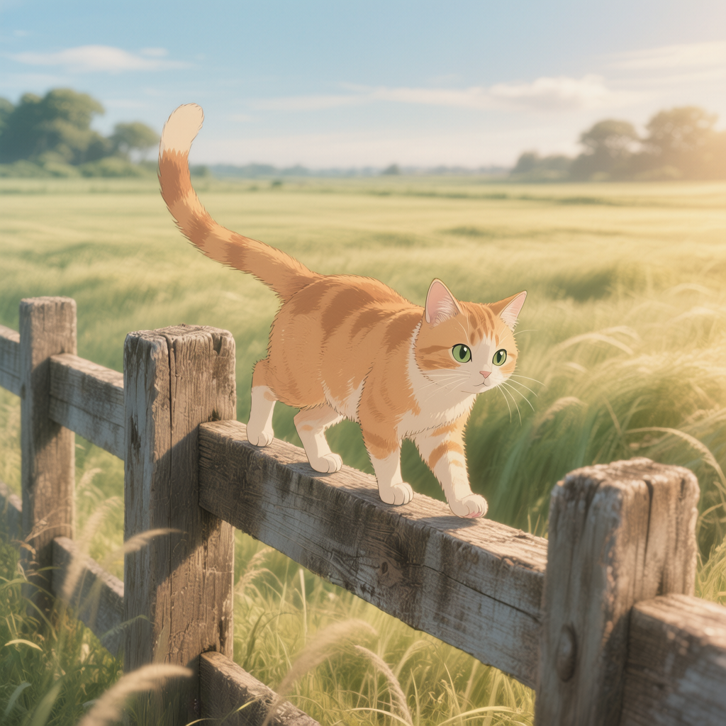 Промт: Anime-style scene of a cat walking carefully along the top of a wooden fence, balanced against a wide open field. The fence boards are weathered and uneven, catching warm light along their edges. Behind, tall grass ripples gently across the field under a calm sky. The cat’s tail sways for balance, fur softly lit by daylight. Distant trees blur into the horizon, and the atmosphere feels peaceful, playful, and quietly nostalgic, filled with gentle motion and rural calm.