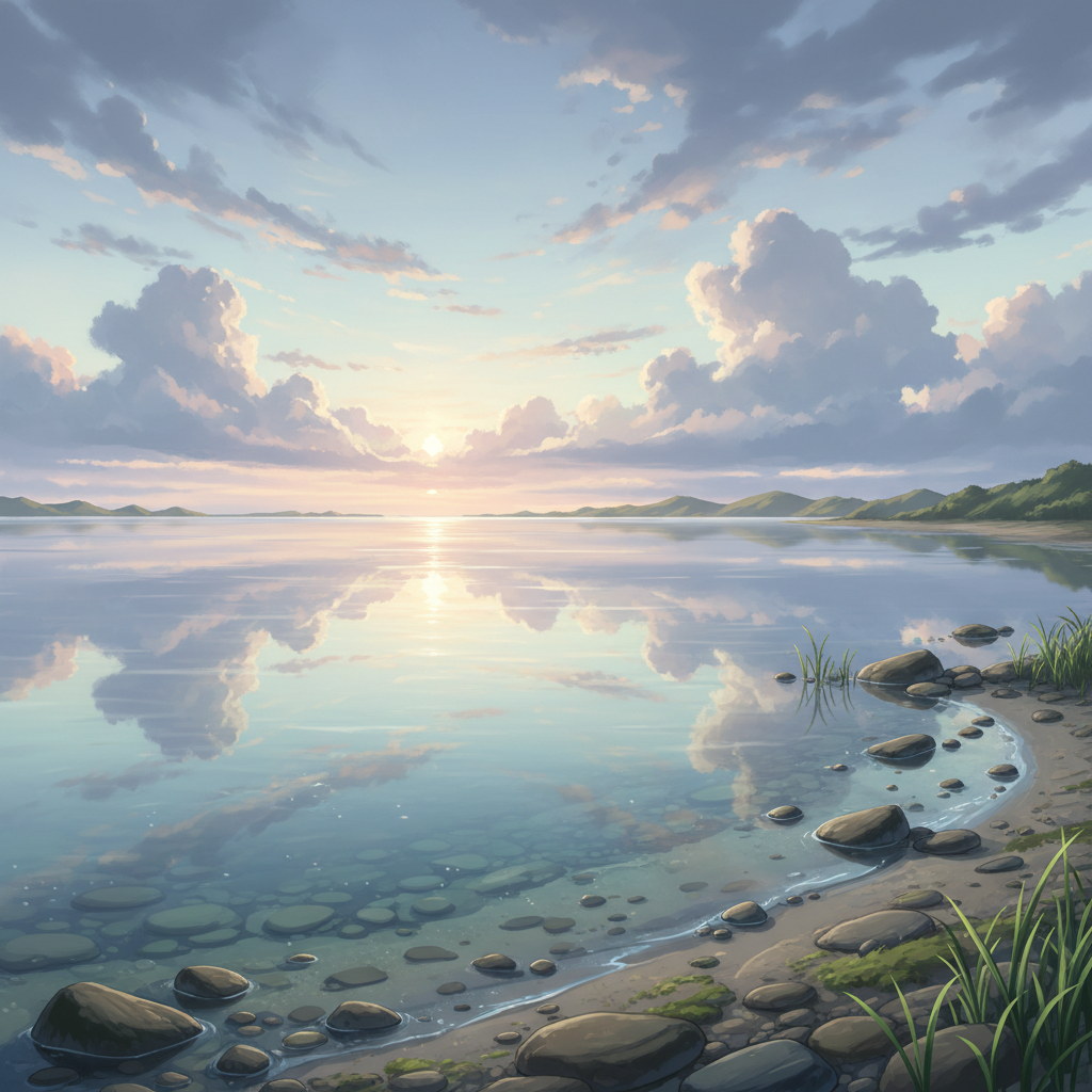 Промт: Anime-style coastline of a calm inland sea with no visible waves. The water lies perfectly still, reflecting the pale sky and distant shoreline like glass. Smooth pebbles and flat stones line the shore, some partially submerged in clear water. Soft light creates gentle color gradients of blue, green, and silver. Reeds and low plants grow near the edge, barely moving in the quiet air. The atmosphere feels peaceful, enclosed, and serene, defined by stillness, balance, and quiet coastal intimacy.