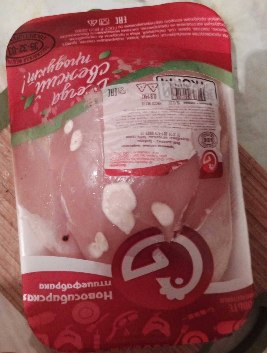 А вот вкуснейшая курочка с какими то стремными пятнами. Выглядит вкусно, не правда ли? Взяли бы в магазине? Вот и я бы не взяла.