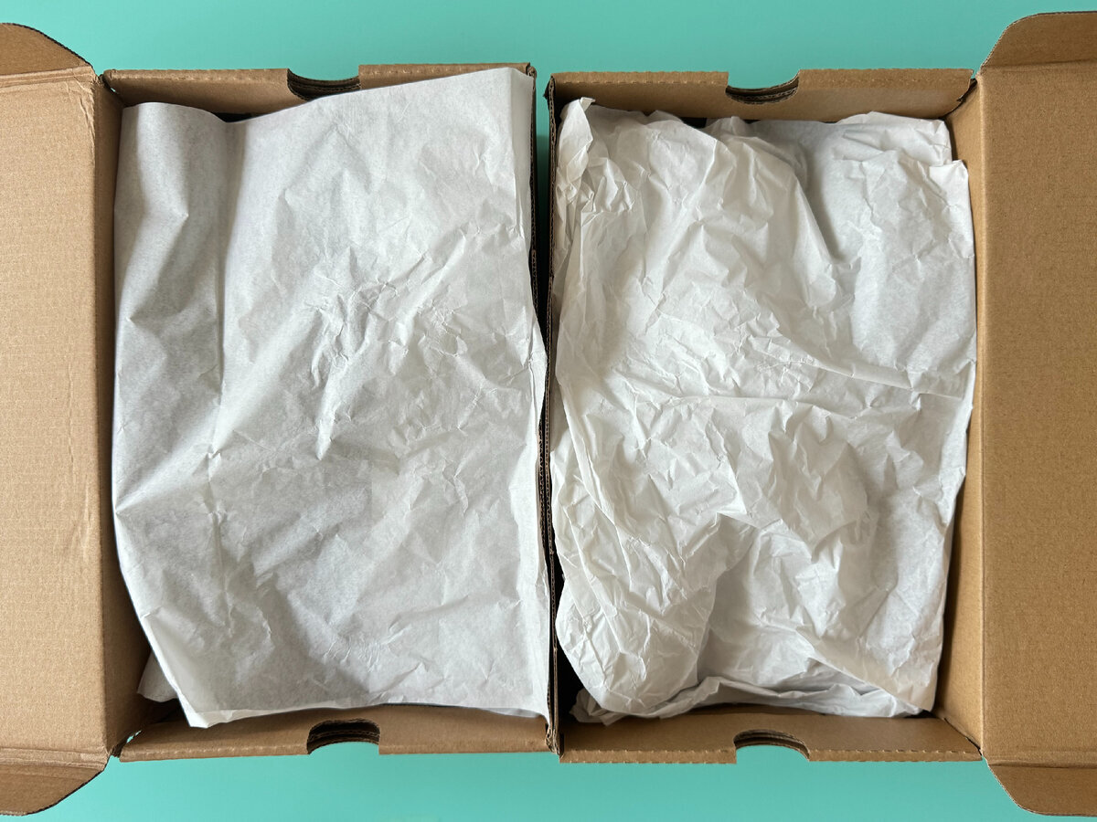 Настало время вскрывать карты. Справа - оригинал, слева - подделка. Обратите внимание на бумагу, в которую заворачиваются кроссовки. В оригинале бумаги гораздо больше чем на копии.