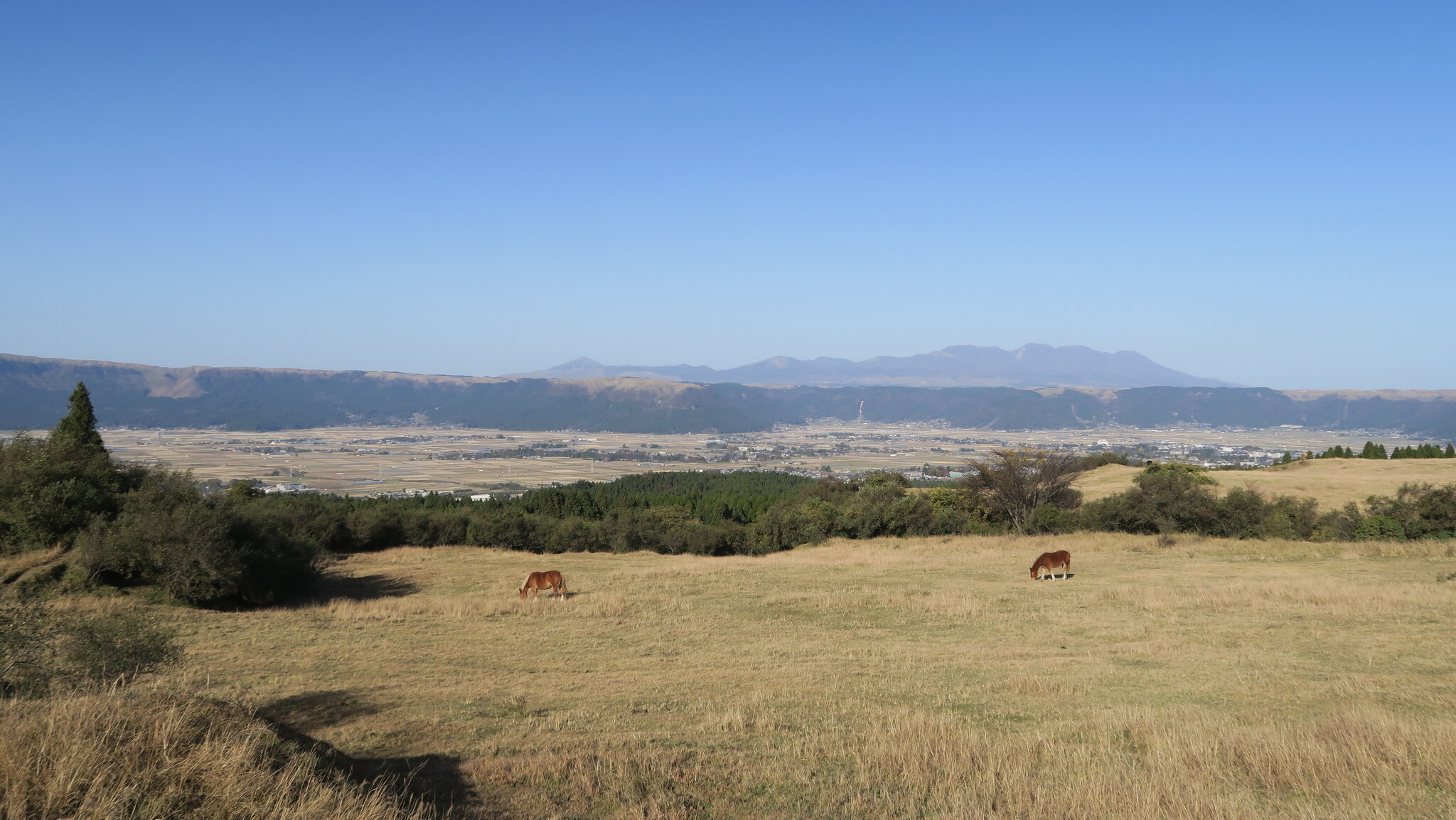Вот такой вид на кальдеру Асо открывается с высшей точки этой дороги. Это не самый удачный кадр, лучше всего делать фото в другое время года, когда трава еще зелёная. А еще лучше, когда долина в облаках - это моя небольшая мечта, поэтому я еще обязательно вернусь в это место.