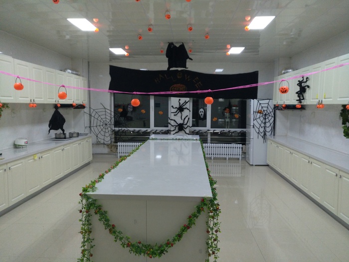 Кухня на этаже, украшали к сабантую на Хэллоуин (слева моя йогуртница йогуртит йогурт))