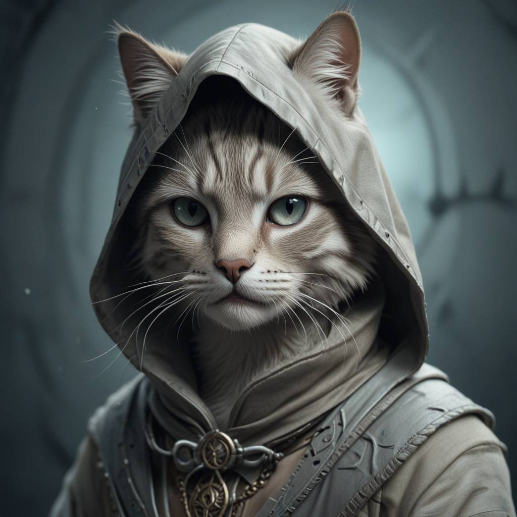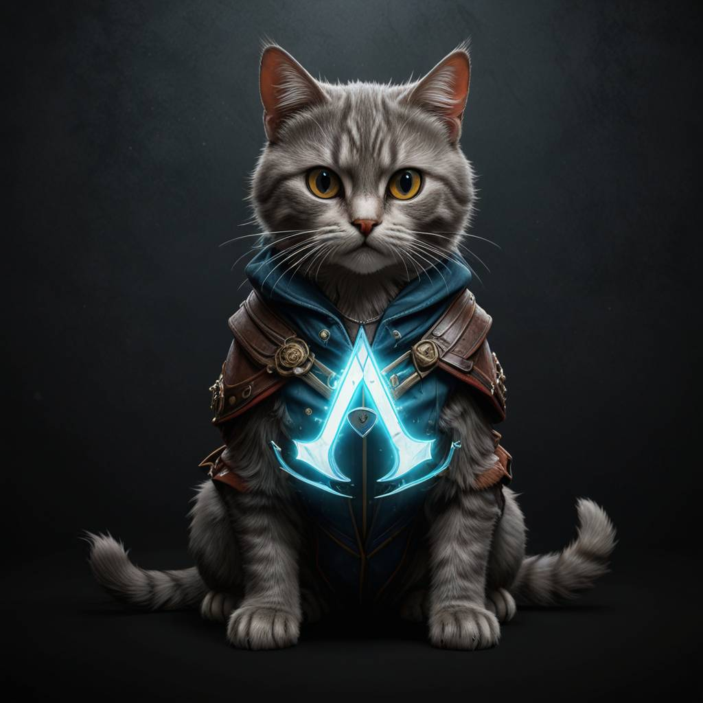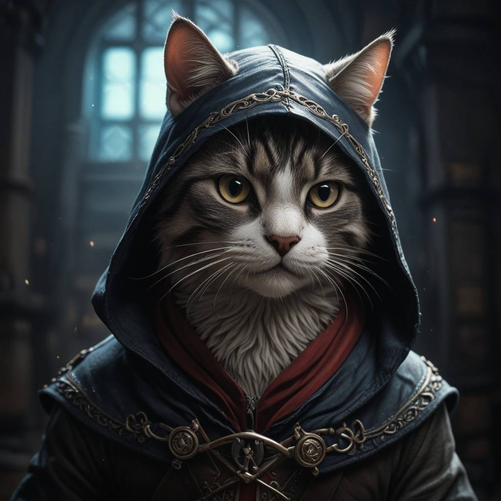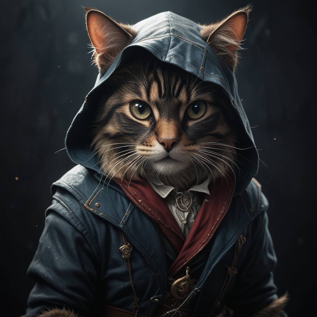"Кошачьи ассасины в деле! 🐾🗡️ В этих шикарных костюмах, эти пушистые герои готовы в любой момент скрыться в тенях и спасти мир... или запрыгнуть на стол за вкусняшкой. 😼⚔️ Идеальный стиль для тех, кто не боится приключений и готов к борьбе с любыми врагами — будь то мыши или нечисть! 🖤🗡️