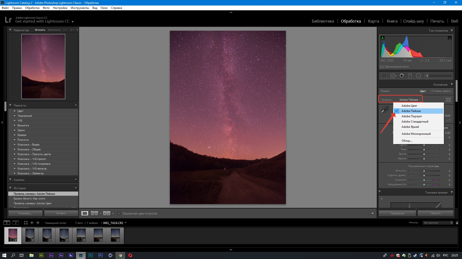 Продолжим, так как я снимал пейзаж, то выберу режим цвета «Adobe пейзаж». Это вообще не принципиально какой режим вы будете использовать, это дело вашего вкуса, в LightRoom можно выбрать огромное количество пресетов, кликнув на иконку браузера профилей рядом с именем режима цвета.
