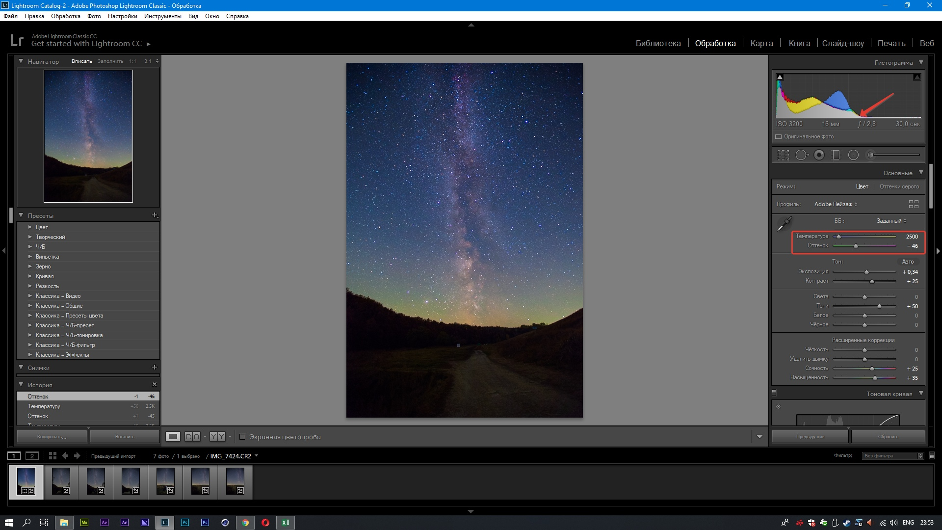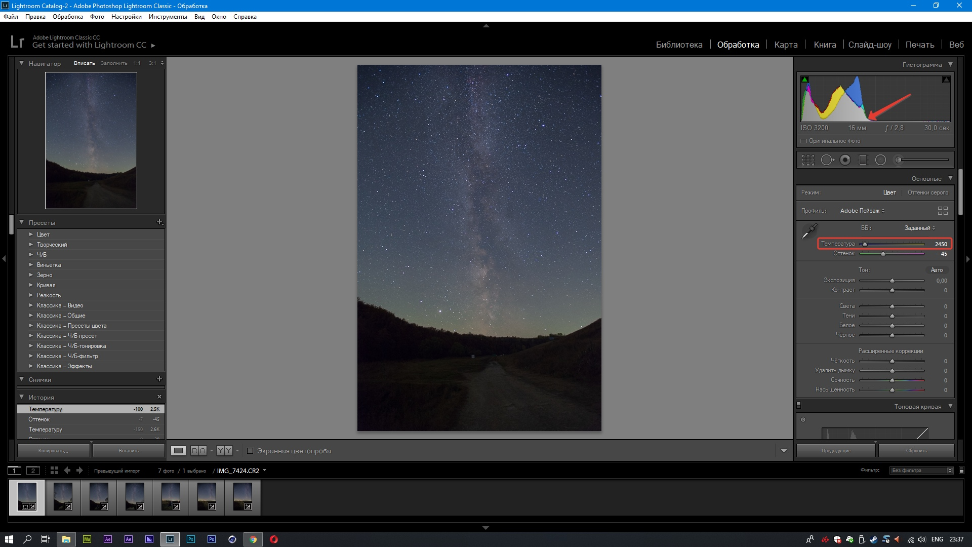 Итак, после импорта в программу нужных вам снимков, выделяем в съемочной серии один из них и идем во вкладку «Обработка», далее будем работать только с параметрами окна гистограммы и режимов цвета с температурой и оттенком на этой вкладке.