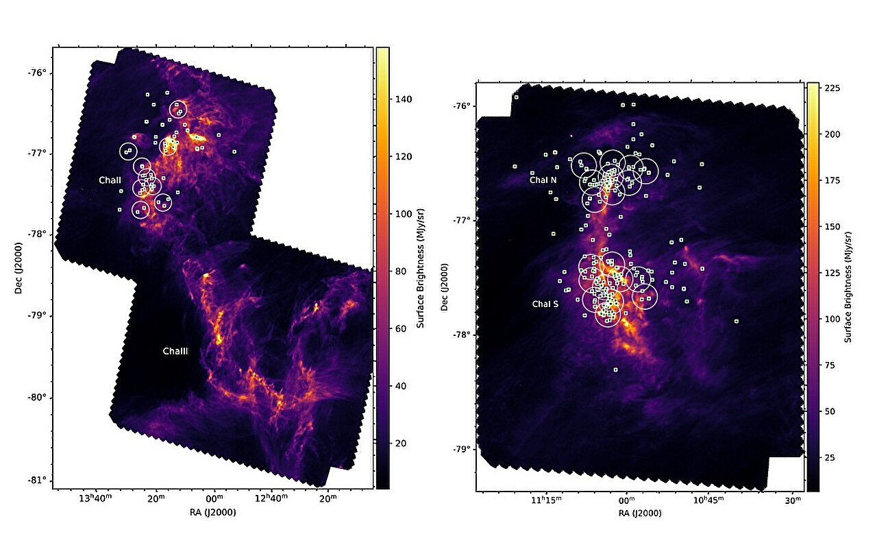 Карты областей Cha II/III (слева) и Cha I (справа) кадры были сделаны телескопом Гершеля с наложенными кругами (диаметром 9') — полями зрения ATCA на 5,5 ГГц. Квадраты показывают расположение известных молодых звезд.