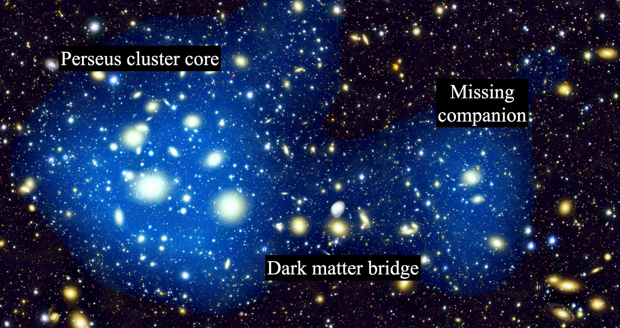Однако новые данные показали, что его асимметричная форма и распределение газа указывают на древнее столкновение с другой галактической группой. Используя метод гравитационного линзирования, астрономы обнаружили невидимый мост тёмной материи массой около 200 триллионов солнц, связывающий Персей с его спутником.