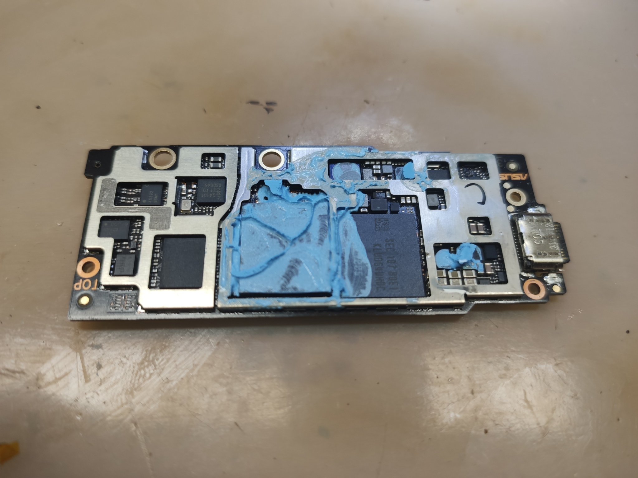 Выпаиваем процессор и оперативную память. Во времена этого ремонта, я еще по старой привычке, снимал и и основную микросхему памяти, в которой хранятся данные. Потому что тогда телефоны с UFS-памятью были еще редкостью и было желание слить дампов на всякий случай на будущее, раз уж аппаратец пришел в ремонт. С опытом стало понятно, что лучше не дышать в ее сторону лишний раз без необходимости.