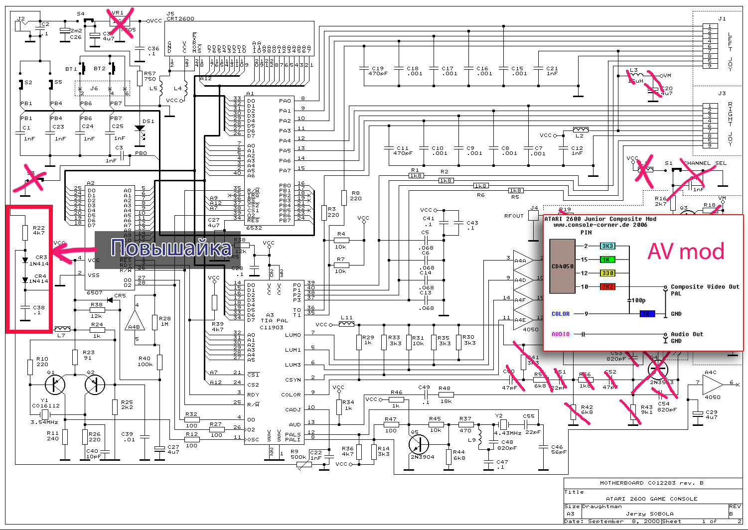 Я же решил сделать сборную солянку с четким пониманием что и как должно работать. Схема питания более, чем стандартная для того времени - входное напряжение 8-9в подается на стабилизатор 78L05 и далее расходится по схеме. НО! Для правильной работы видеочипа TIA (Television Interface Adaptor), а точнее, для правильной работы цвета, на чип необходимо дополнительное напряжение 7-8в. И если в оригинальном варианте схемы это напряжение формируется с применением примитивной повышайки на двух диодах и тактового генератора, то в версии Jr. пошли более простым путем - повышенное напряжение забирается до стабилизатора, прямо с блока питания. Меня этот вариант не совсем устраивал, так как я собирался запитывать приставку от обычной USB зарядки, поэтому выбрал участок из оригинальный схемы, но стабилизатор на всякий случай оставил. Подключение джойстиков и переключателей режимов в обеих версиях абсолютно одинаковые, оставляем как есть.