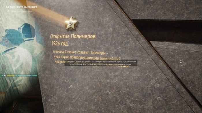 Единственное, что вызывало у меня вопросы - это временные периодизации. Нам вроде бы сообщают, что события игры разворачиваются в конце 50-х годов, однако некоторые музыкальные композиции появились намного позже. Я был удивлён, услышав по радио песни Виктора Цоя ближе к финалу игры. Напомню, что его творчество в основном относится к конец 80-х годов. Тем не менее, я считаю, что мы можем простить разработчикам такие вольности. Это ведь мир, частично основанный на Советском Союзе, а значит, здесь многое допустимо. Даже мультфильм "Ну, погоди!", показываемый в точках сохранения, был выпущен в 1970 году. В альтернативной версии СССР даже есть нейросеть, которая создает музыку будущего. Точнее говоря, она прогнозирует развитие музыкальных тенденций и предлагает нам результаты своей работы. В итоге получается своеобразное "советское техно". Кстати, музыкальная часть игры ясно показывает, что это не Fallout, несмотря на частые сравнения. В Fallout музыка застывает в 60-х годах прошлого века из-за плохо завершившегося кризиса. Здесь же музыка представлена как "современная для того времени". К тому же, маленький апокалипсис, как я понимаю, произошёл только на территории предприятия. В остальном мире жизнь продолжается.