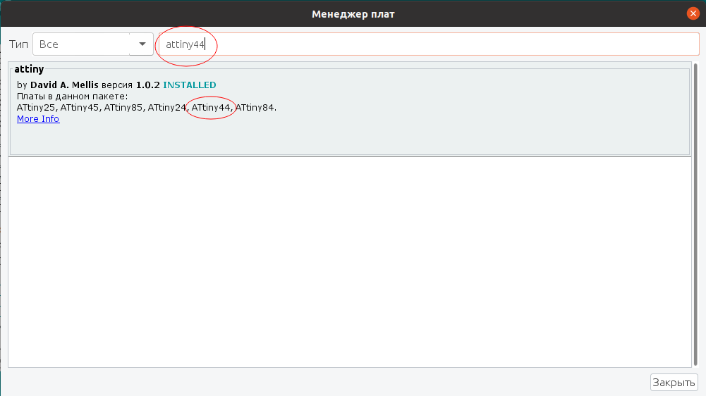 Выберите и установите пакет новых плат ATtiny45, ATtiny85, ATtiny44, ATtiny84