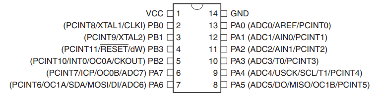 — ATtiny44V: 0 — 4 МГц при напряжении питания 1.8 — 5.5В, 0 — 10 МГц при напряжении питания 2.7 — 5.5В